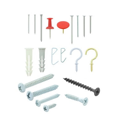 (360 piezas) Set surtido de ganchos, colgadores de cuadros, alfileres, tachuelas, clavos, tacos plásticos de anclaje y tornillos