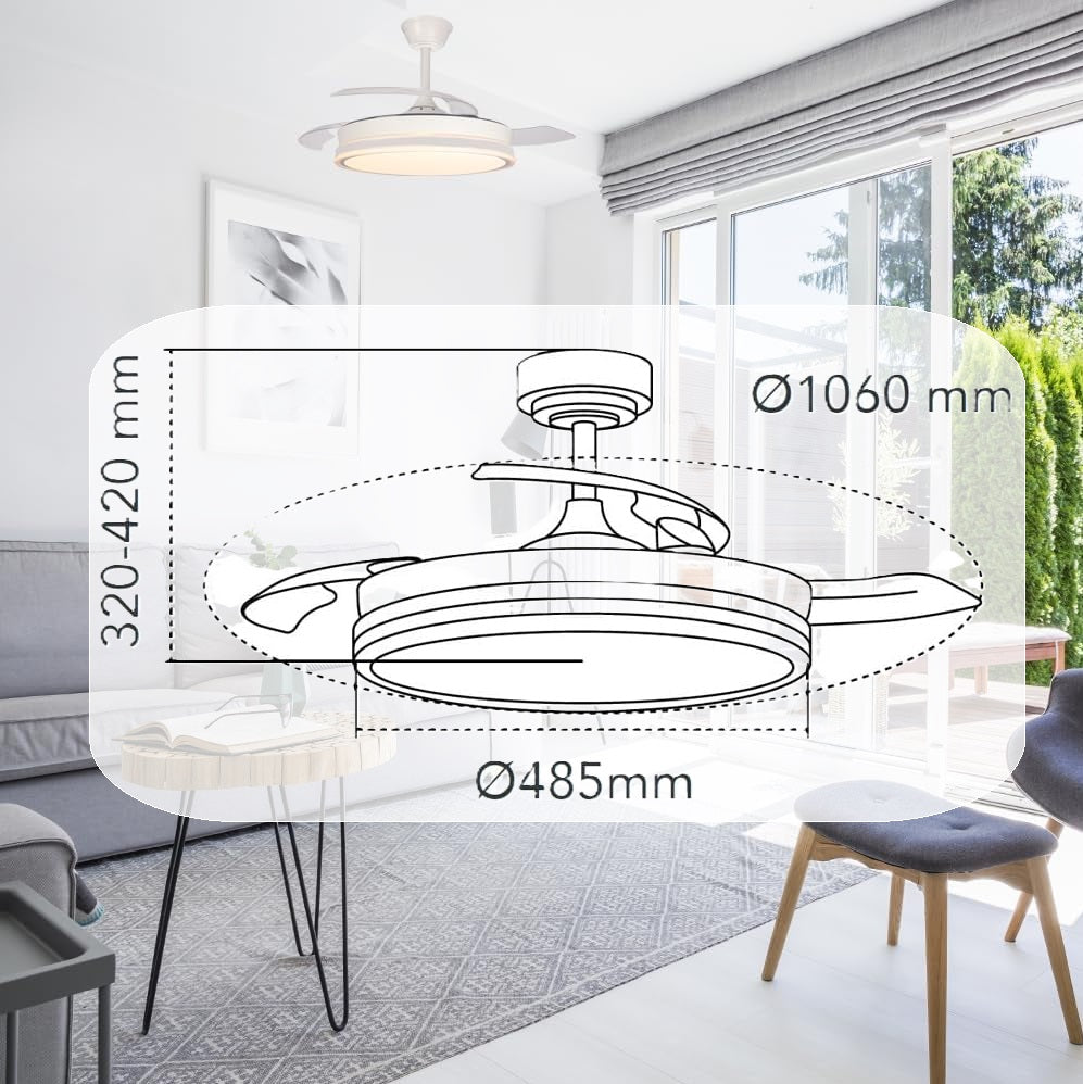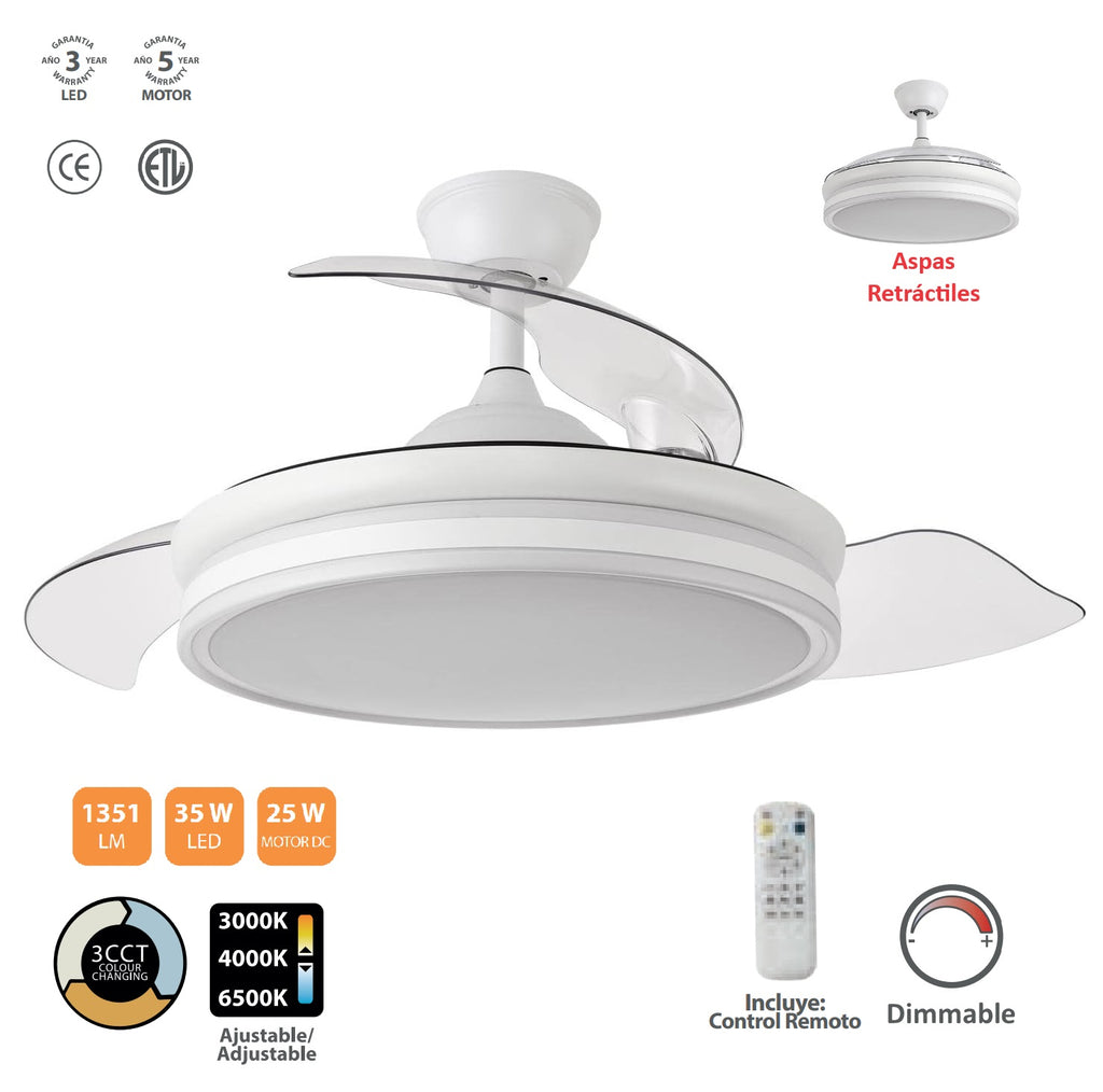 Un ventilador de techo LED retráctil en color blanco con CCT (temperatura de color cálida, neutra y fría) 35 watts y 1350 lumens, sería una opción elegante y funcional para tu hogar. La característica retráctil permite que las aspas del ventilador se plieguen hacia adentro cuando no están en uso, lo que puede ser especialmente útil para habitaciones con techos bajos. Además, la capacidad de ajustar la temperatura de color de la luz te permite crear diferentes ambientes. Material de hierro, plástico y acrílico de alta calidad con una dimension de 1066.08mm, voltaje de 90-300v 50-60Hz, incluye control.