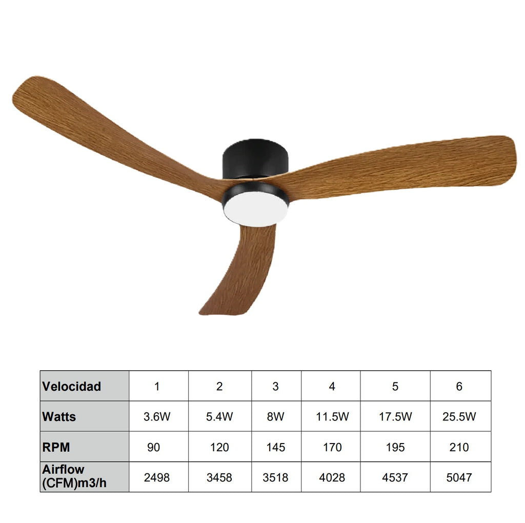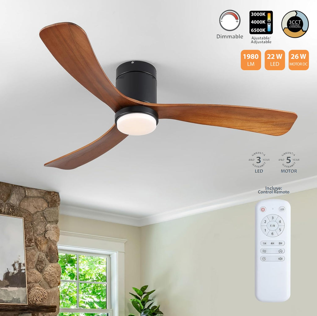 Abanico De Techo Ventilador LED Negro Madera CCT 22W 1320Mm. Funcional Y Elegante Control Dimiable