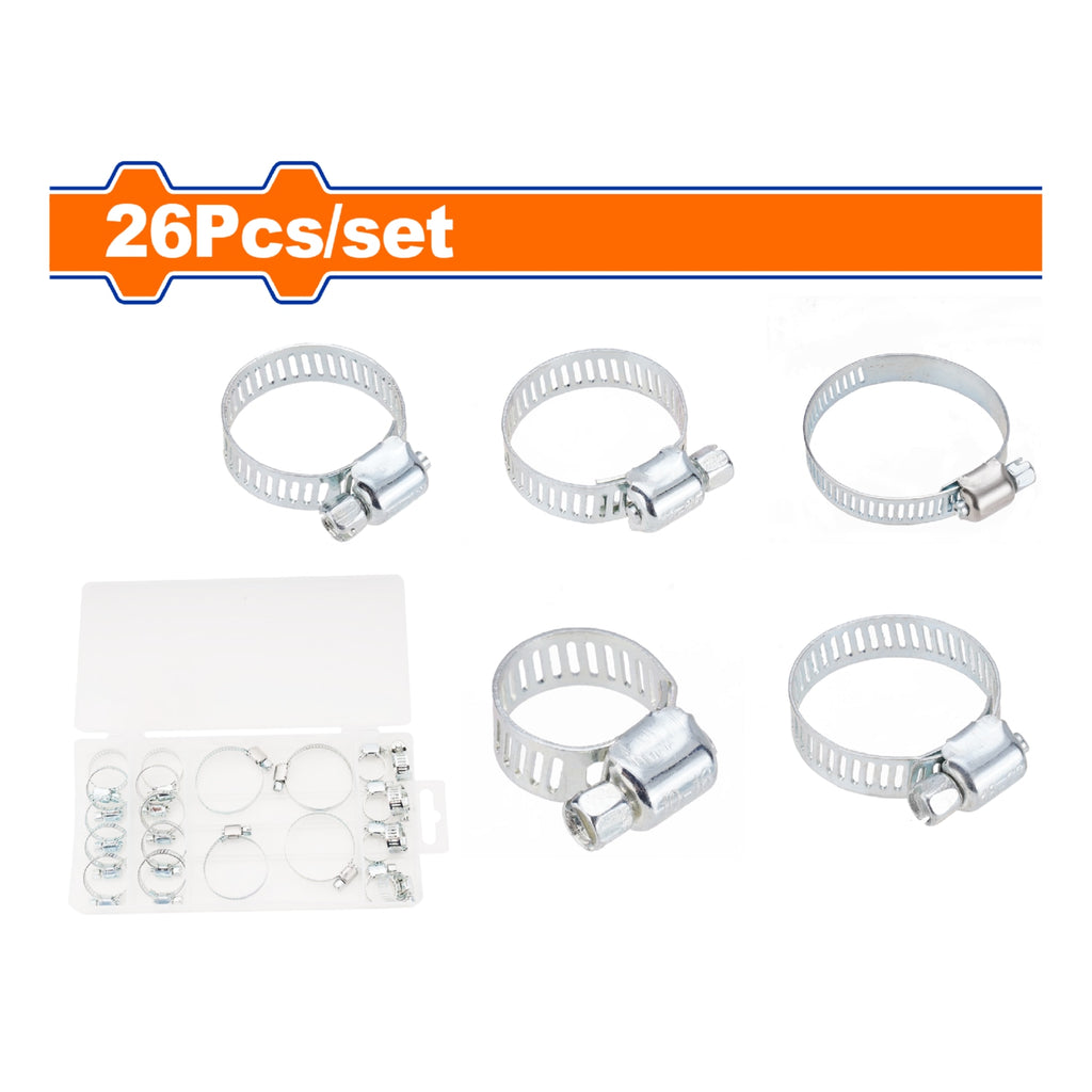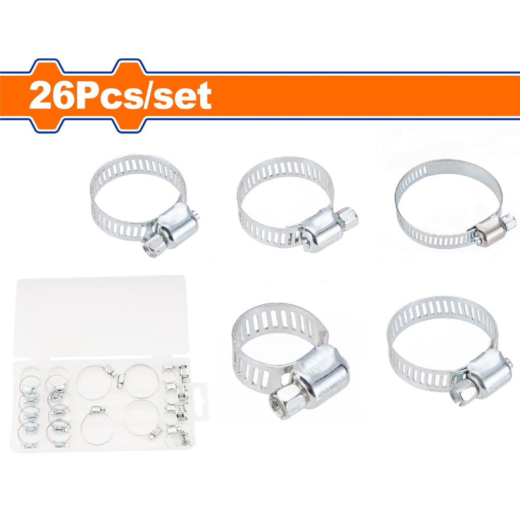 | Características | Abrazadera sinfín Galvanizadas. Acero al Carbono. 26 piezas. Tamaño: 16mm-35mm. |