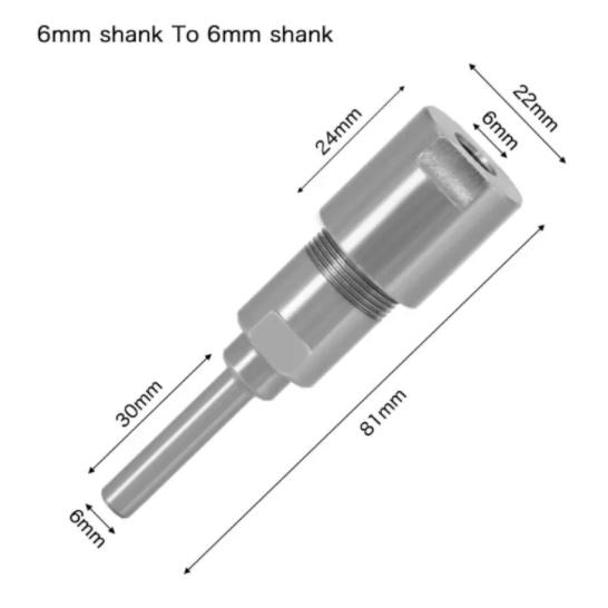 Fácil de usar, coloque el vástago de extensión de la clavija del enrutador en el vástago de la broca del enrutador de 6mm-6mm y el vástago de la broca del enrutador en el vástago de extensión y apriete ambos.