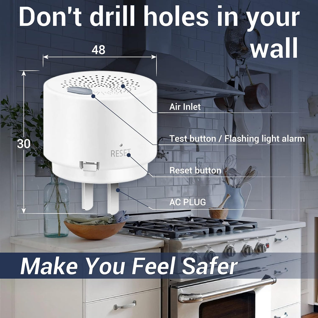 Alarma detector de gas y monoxido de carbono de enchufe, uso por WiFi.