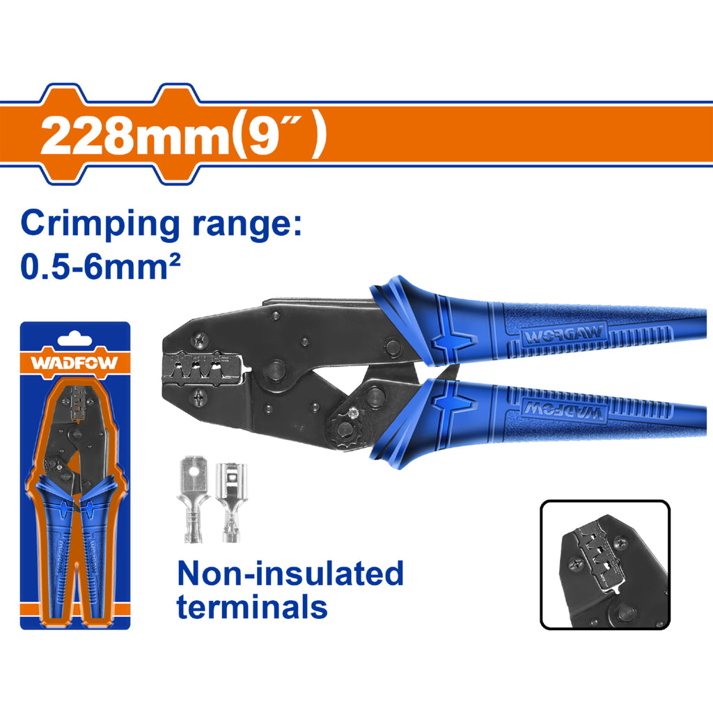 | Características | Rango de engaste: 0.5-6mm². Para terminales y receptáculos sin aislamiento. AWG: 20-10. Longitud: 9 pies. Mango de diseño único de ABS. |
