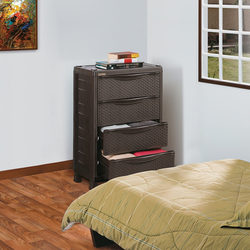 | Características | Cajonero con gran capacidad de almacenamiento. Tiene 4 cajones grandes con sistema de fácil apertura.Apariencia Rattan. |