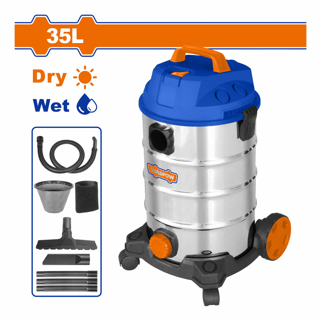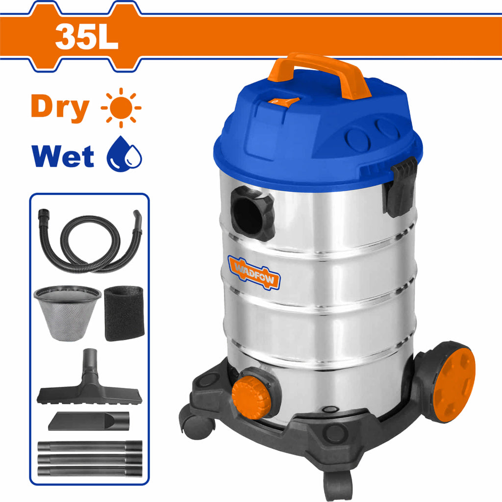 | Características | Aspiradora de Limpieza 2 en 1 35L 1200W Limpieza húmeda y seca 110V-120V~60Hz. Presión de vacío: >18kPa Filtro: filtro de tela. Con función de soplado. Incluye accesorios. |