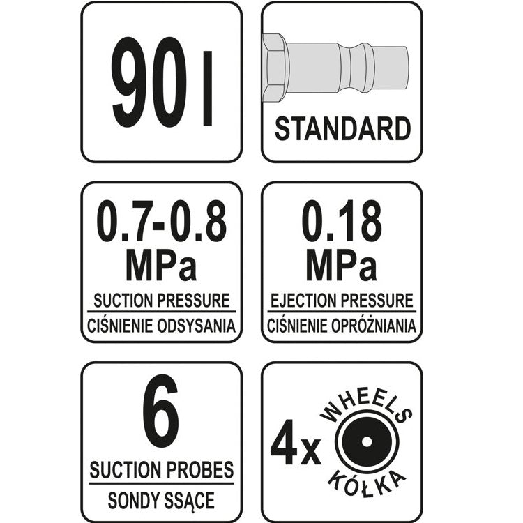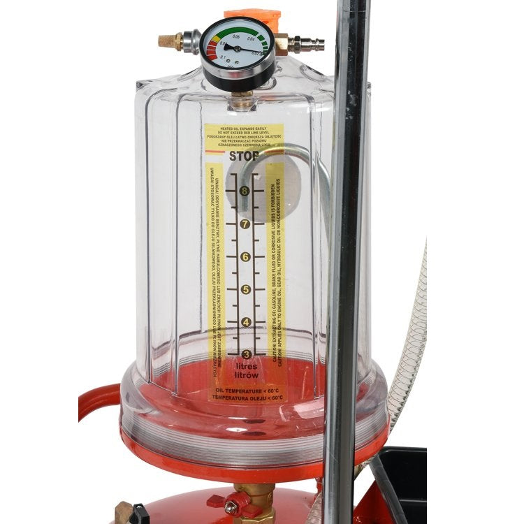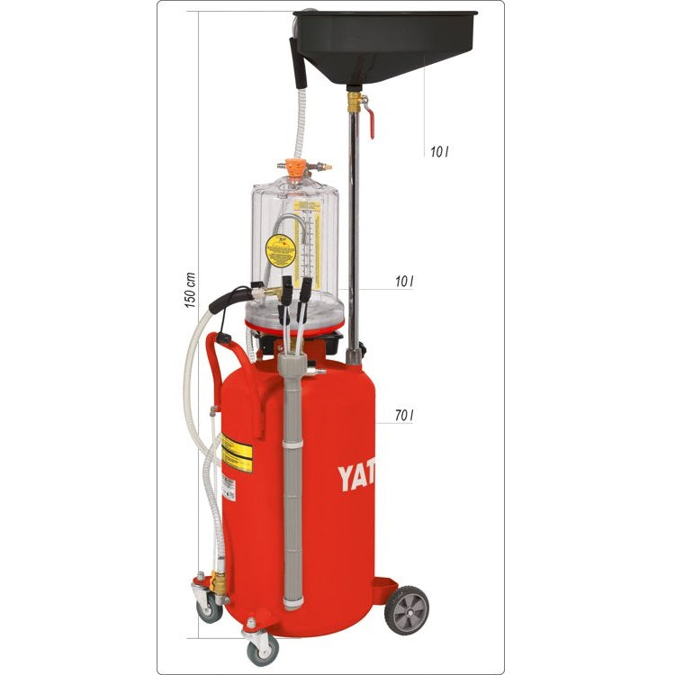 Bandeja Recolectora de Aceite con Expulsor Neumatico. Tanque de 70 litros. 6 Sondas de Succion. Embase recolector de 10 L. Embudo con capacidad de 10 L. Con Manometro y Valvula de Seguridad. Para extraer aceite de desecho de motores, cajas de engranajes