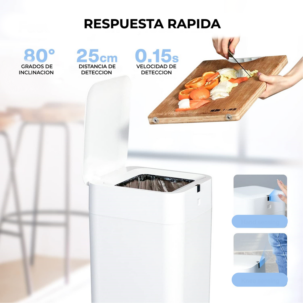 - Apertura de la tapa sin contacto: con un simple movimiento de la mano la tapa se abre rápidamente, lo que te permite desechar la basura sin ningún contacto físico.