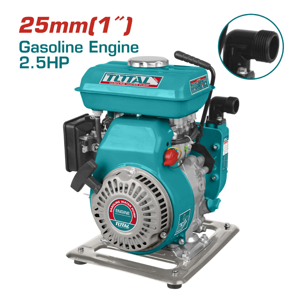 Bomba de Agua de Gasolina. Diámetro del Puerto de Descarga: 25 mm (1 ''“). Flujo Máx.: 100 L / min. Elevación Máx. de Flujo: 16 m. Cabezal de Succión Máx.: 7m. Motor de Gasolina de 2.5HP. Desplazamiento 105cc. Tanque de Gasolina 1.2L. Sistema de arranque: Retroceso.