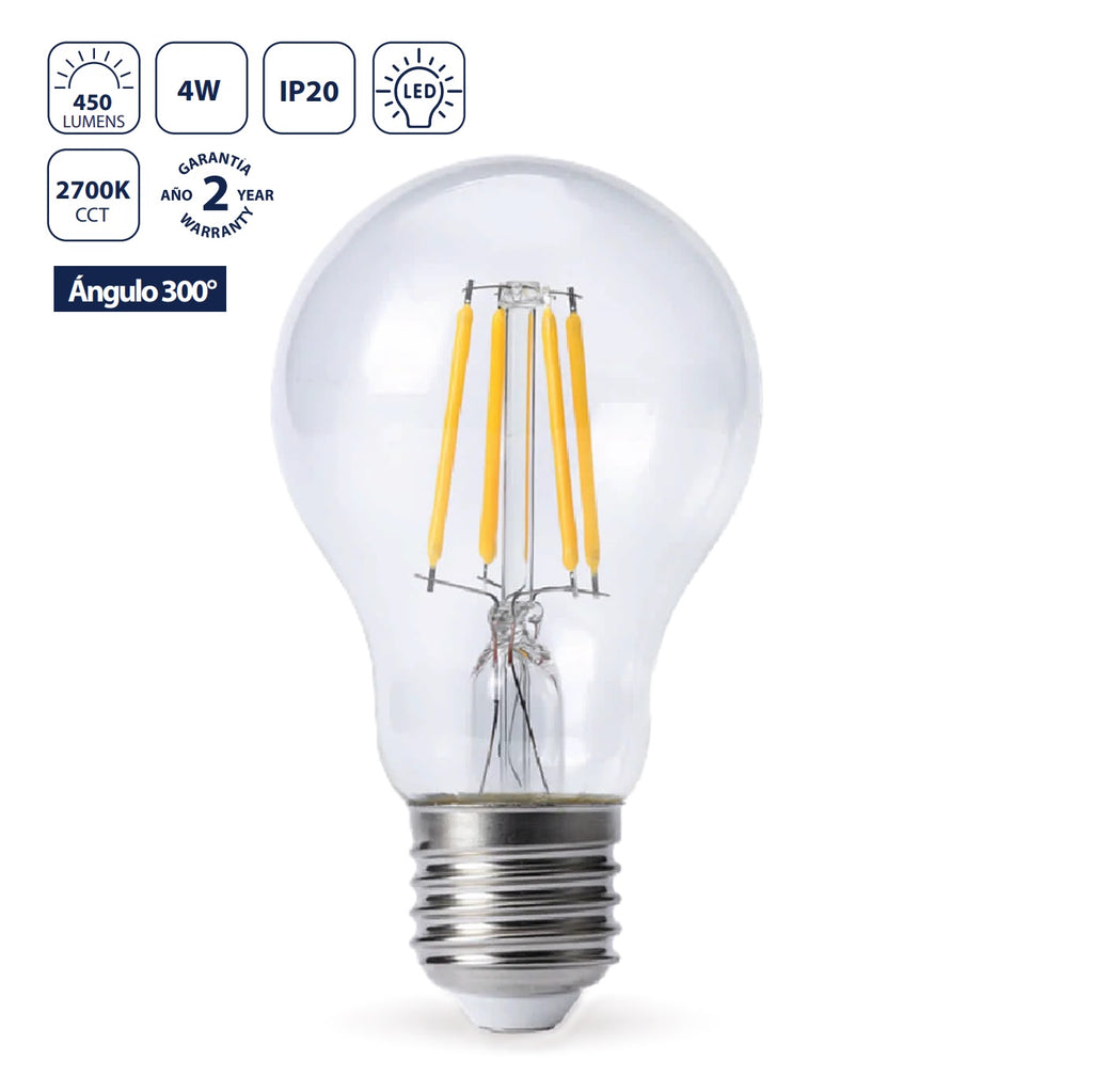 BOMBILLO FILAMENTO LED A19 E27 4W 2700K (luz cálida) con rosca gruesa E27 proporciona un ambiente acogedor, distinguido y diferente, dando un haz de luz homogénea y agradable. Los componentes de gran calidad incorporados en la fabricación permiten tener un Índice de reproducción Cromática(CRI)superior a 80, permitiendo una reproducción de colores muy natural. Elencendido inmediato, la alta eficiencia y su apertura proporcionan un conforte iluminación perfecta. Posee una calidad luminica de 450 y un ángulo de 300° con vidrio transparente. Posee un tamaño de 60*108 milimetros