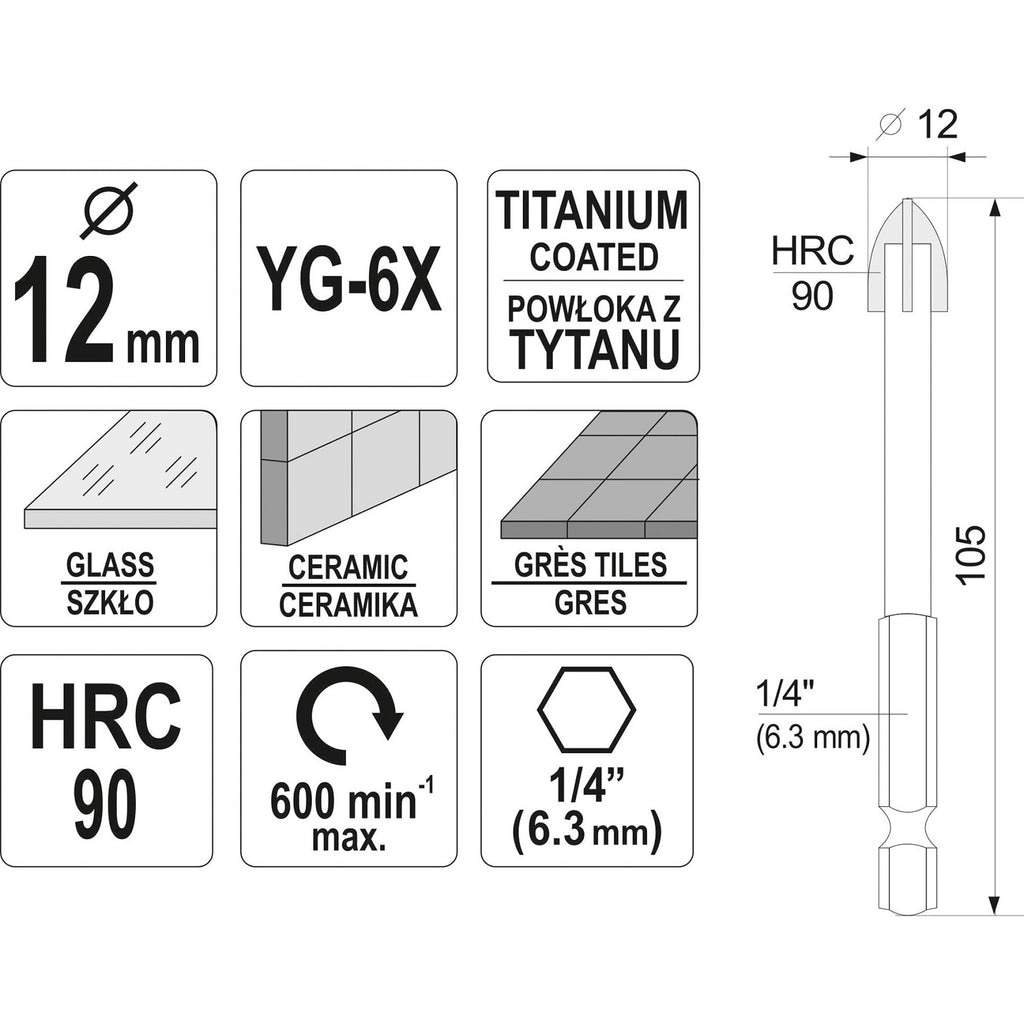 TAMAÑO: 12 MM, CON VÁSTAGO HEXAGONAL, MATERIAL: 45 # ACERO AL CARBONO, PUNTA: YG6X, DUREZA DE LA PUNTA: 90HRC Y VÁSTAGO: 38HRC, LONGITUD: 105 MM, RECUBIERTO DE ESTAÑO