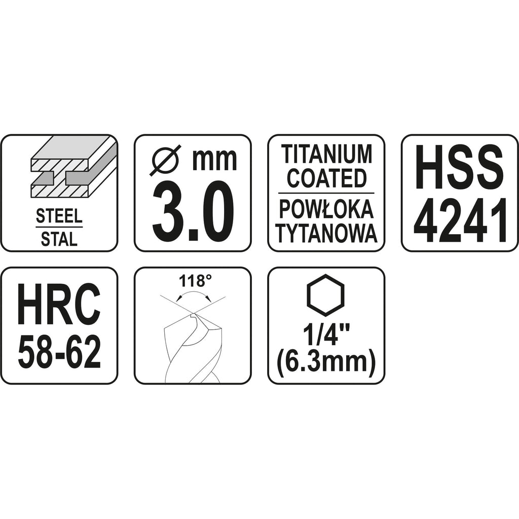 Destinado a uso profesional e industrial. La cuchilla cruzada ''Split Point'' con un ángulo de punta de 118° permite taladrar sin punzonado previo, también con grandes diámetros de broca, asegurando un centrado perfecto. Permiten taladrar en cualquier dirección y en cualquier ángulo, perfectos para taladrar agujeros. La superficie rectificada garantiza una perfecta precisión de perforación. Fabricados en una sola pieza de acero, son muy resistentes y duraderos. El recubrimiento duro de 58–62 HRC recubierto con nitruro de titanio mantiene la resistencia al daño y al desafilado, manteniendo la geometría de las brocas • La menor temperatura de perforación y la rápida disipación del calor no causan la fusión del zinc y la subsiguiente corrosión de las brocas • El menor coeficiente de fricción reduce la adherencia de virutas y limaduras a las brocas.Vástago hexagonal de 1/4″ (6,3 mm)