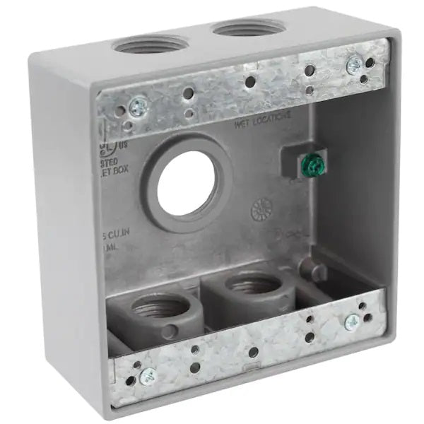 Caja Electrica Exterior 4''X4''. 2 Entrada con 5 Huecos de 3/4''. Dimensiones 2-3/16''X4-9/16''X4-9/16''. Resistente al agua. Material Aluminio. Tornillo y Tapa impermeable incluida. Color Gris. Certificado UL-471217. Empaque color Blister Codigo de Barra