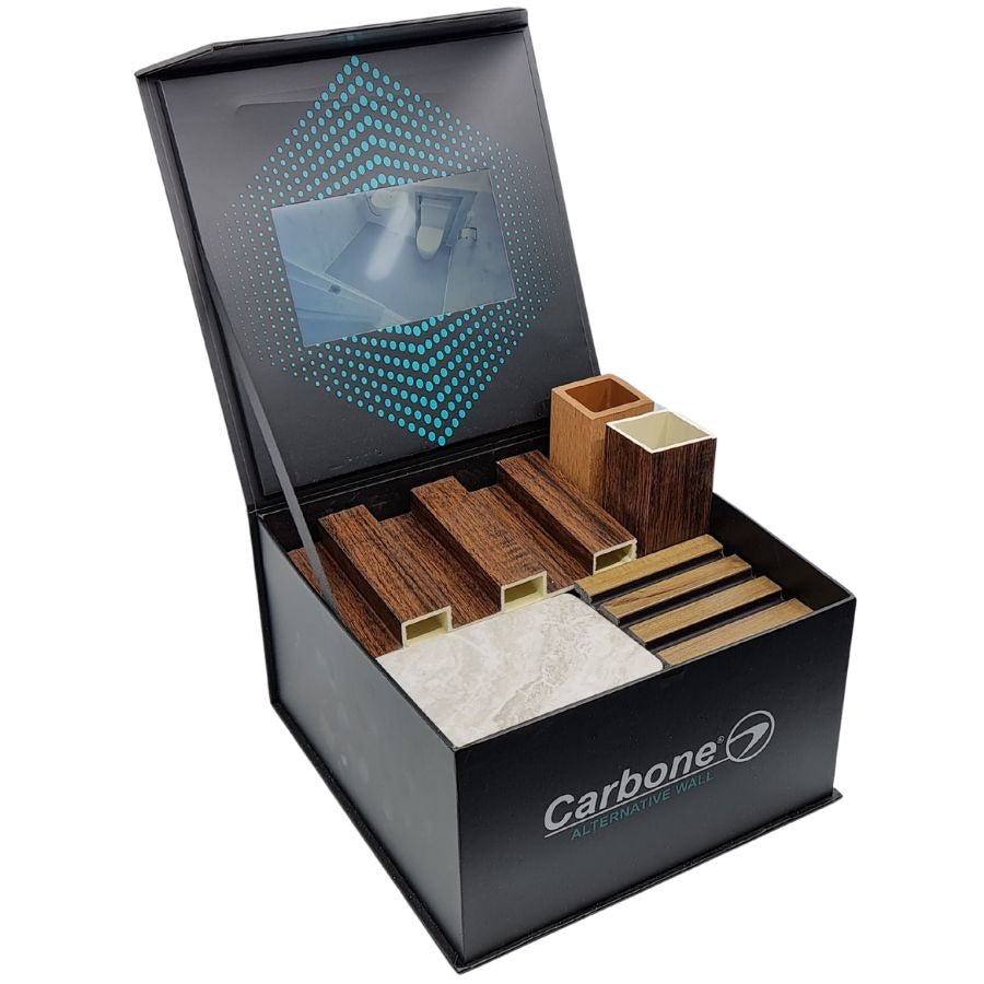 Caja mostrario carbone alternative wall con pantalla de video incluida y autoplay cuando abre