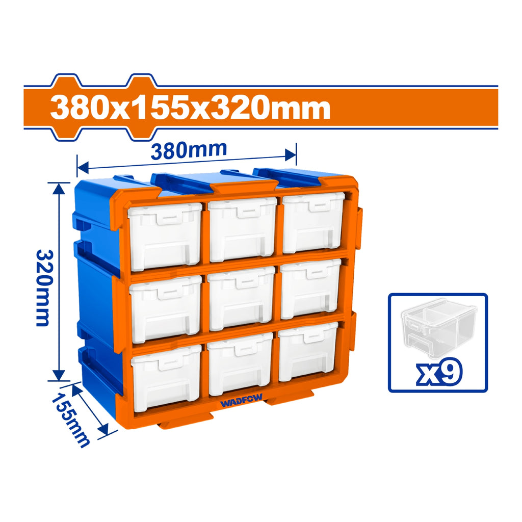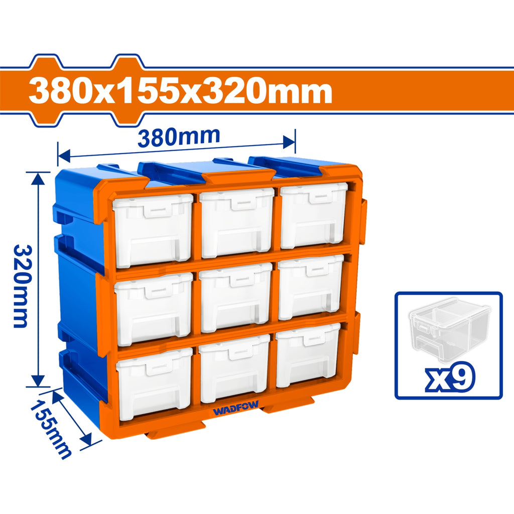 | Características | 380x155x320mm. Set de 9 piezas. Se une vertical u horizontal. Tamaño de cada contenedor: 150 x105x80 mm. Plástico PP. Opción a expandir. Se acomoda vertical u horizontal. Puede ser colgado. |