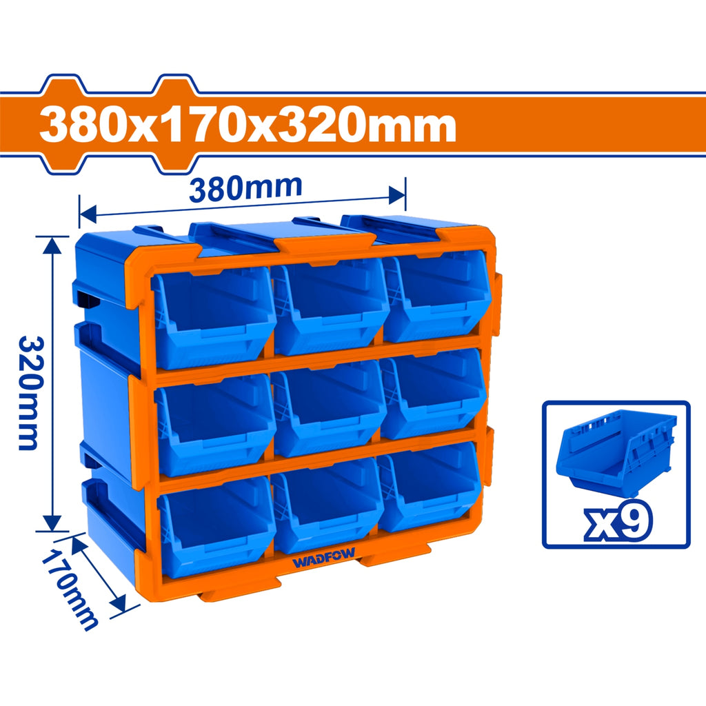 | Características | 380x170x320mm. Set de 9 piezas. Se une vertical u horizontal. Tamaño de cada contenedor: 165x110x80mm. Plástico PP. Opción a expandir. Se acomoda vertical u horizontal. Puede ser colgado. |