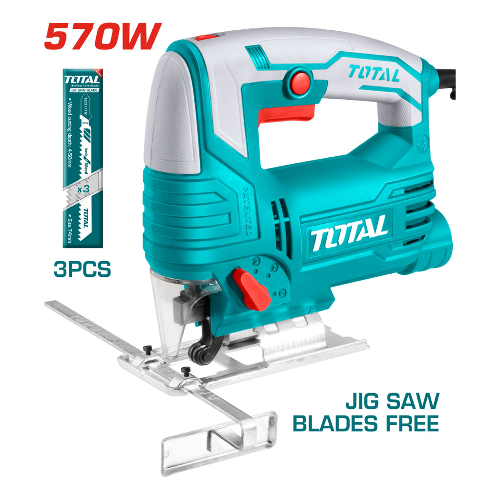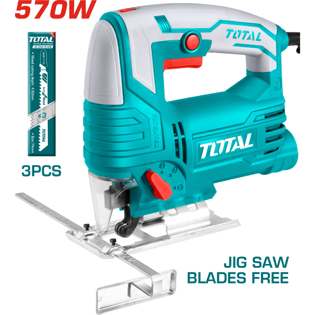 Caladora Eléctrica de 570 W. Voltaje: 110-120V ~ 50/60Hz. Velocidad sin carga: 800-3000 rpm. Capacidad de corte: Madera: 65mm. Acero: 8mm. Función de péndulo de 4 pasos. Base de aluminio. Trae (3) piezas de hojas de Sierra.