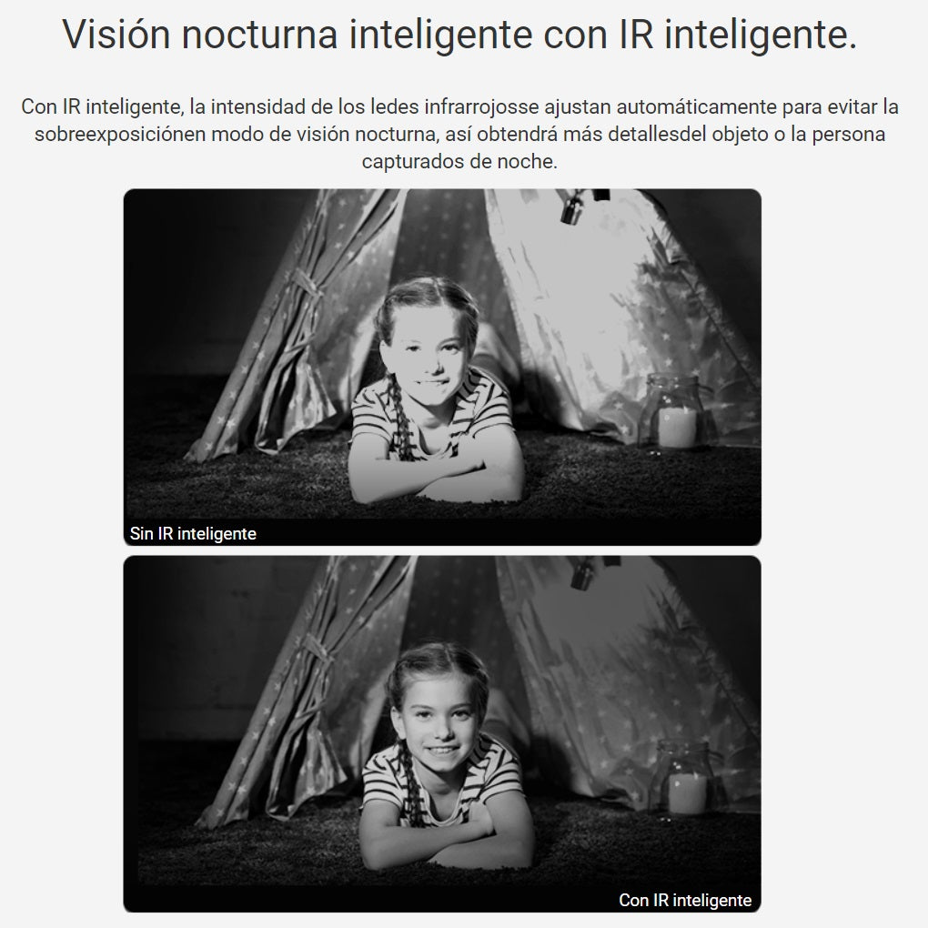 -Con IR inteligente, la intensidad de los leds infrarrojos se ajusta automáticamente para evitar la sobreexposición en modo de visión nocturna, así obtendrá más detalles del objeto o la persona capturados de noche (hasta 10 m).