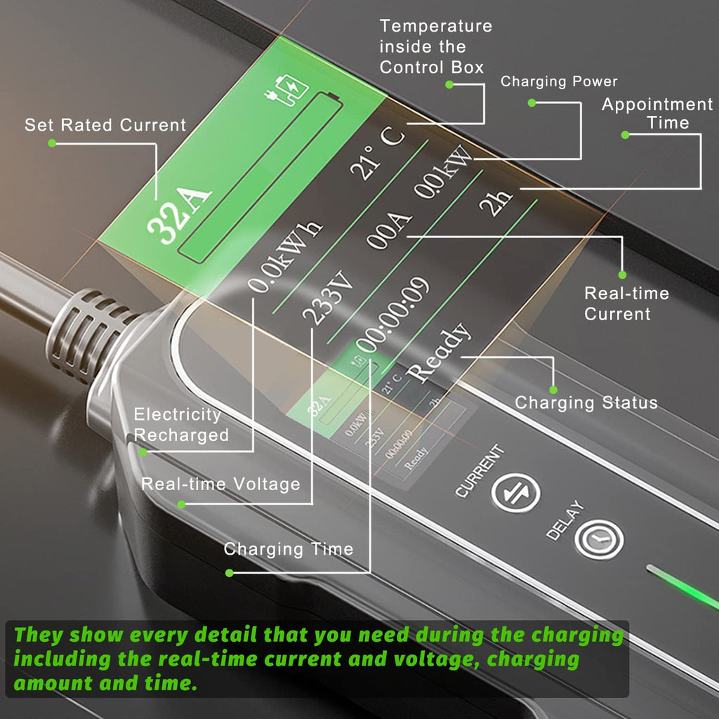 -El cargador EV se puede retrasar (1-12 horas), el tiempo de carga se puede ajustar de 1 a 12 horas de antelación, programa tu sesión de carga con el temporizador de arranque retrasado, ahorrando costos de electricidad y mitigar las cargas máximas. -Cargador eléctrico de autos amperaje ajustable: 32A/24A/20A/16A/10Amp.