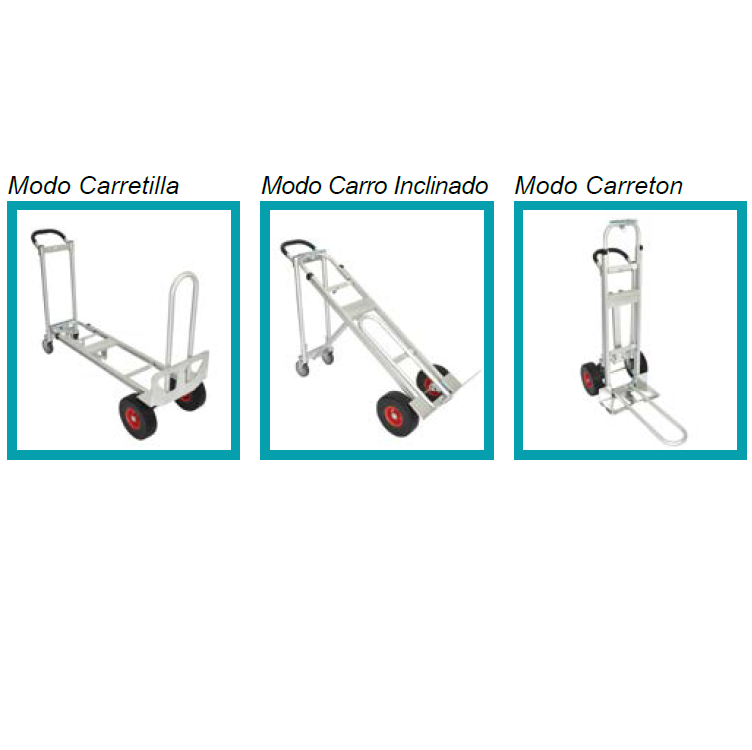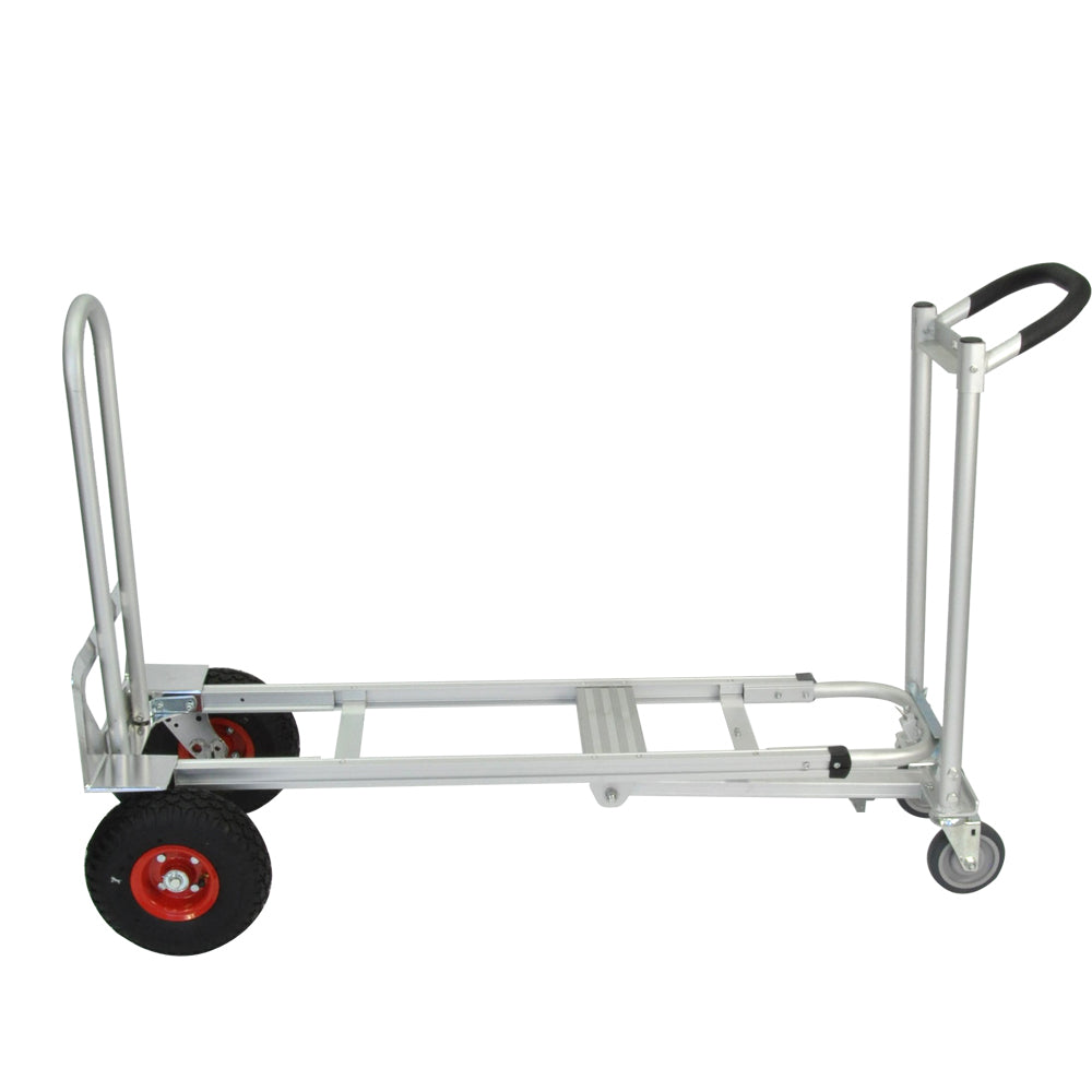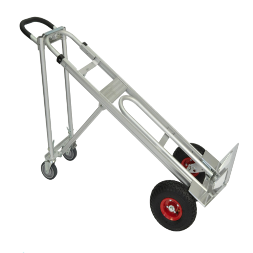Carretilla de aluminio 3 en 1 convertible a carretón, y a carro inclinado para línea blanca y cajas grandes. 300kg Capacidad. 2 ruedas neumáticas 10'' y 2 ruedas 5'' rotativas. Plancha de 7.5'' *18''. medidas L1380*W520*H980mm.