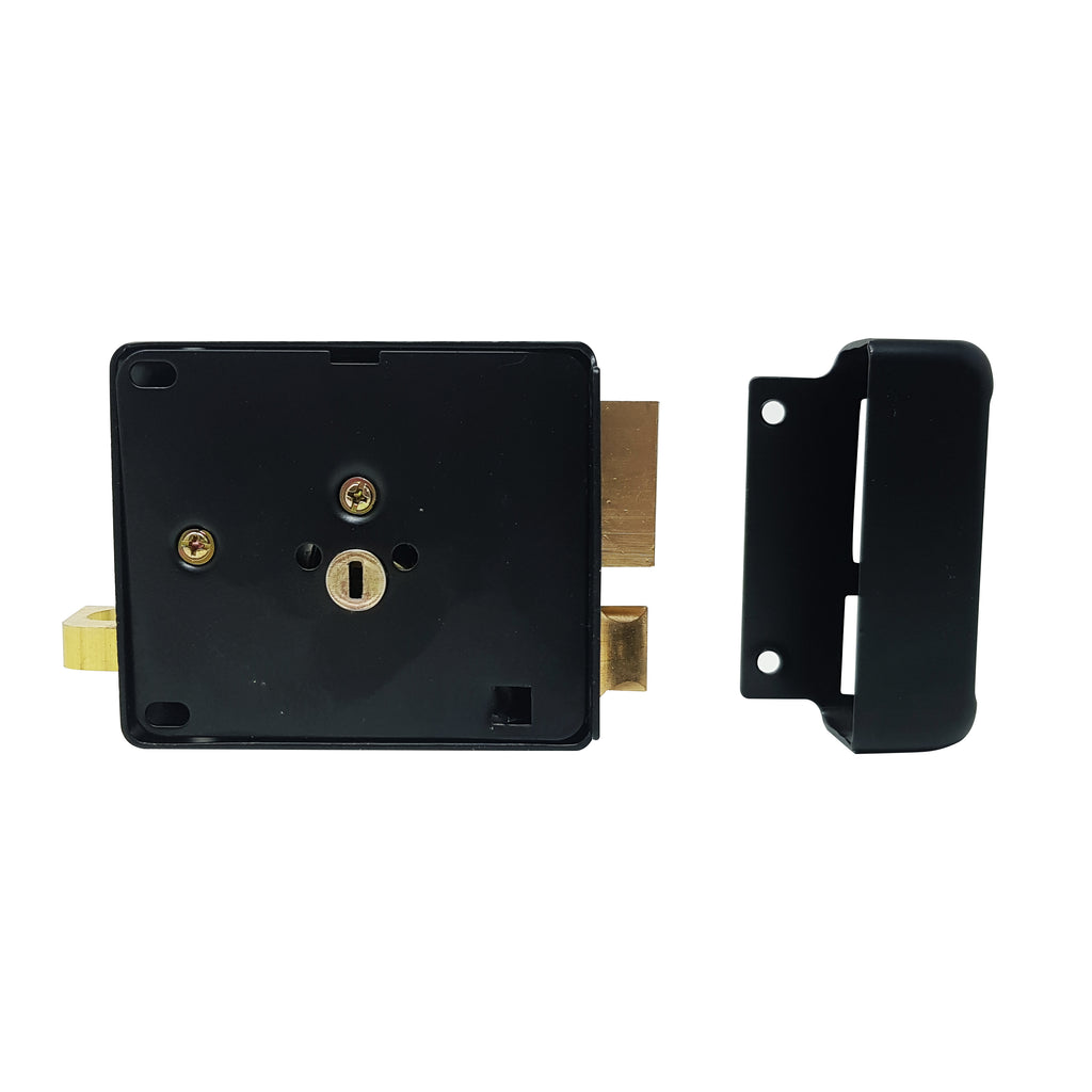 Cerradura de sobreponer para madera para lado izquierdo. Con 3 llaves. Color negro. Con gatillo y cilindro de bronce Empaque en blister. Marca Schroeder