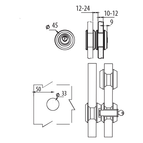 Cerradura especial para sistema slider. Acabado satinado. Vidrios de 10-12 mm
