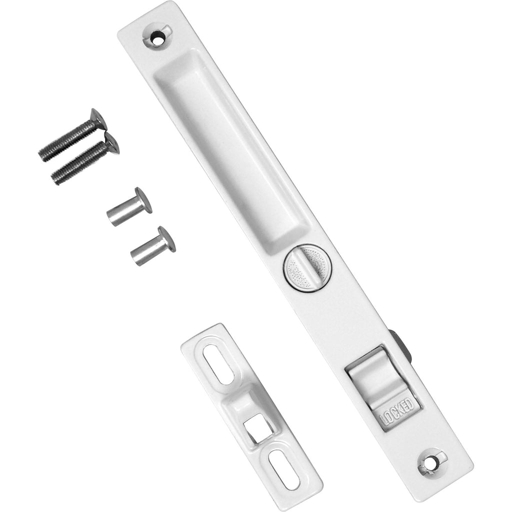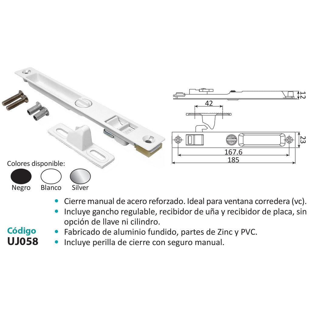 Cierre Embutido Manual para Ventana y Puerta Corredera. Aleacion de Zinc. Incluye Recibidor y Gancho. Color blanco