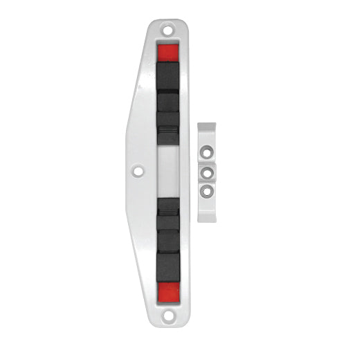 Cierre perimetral de doble gancho. Incluye recibidor y gancho. Tornillo visto. Acabado color Blanco.