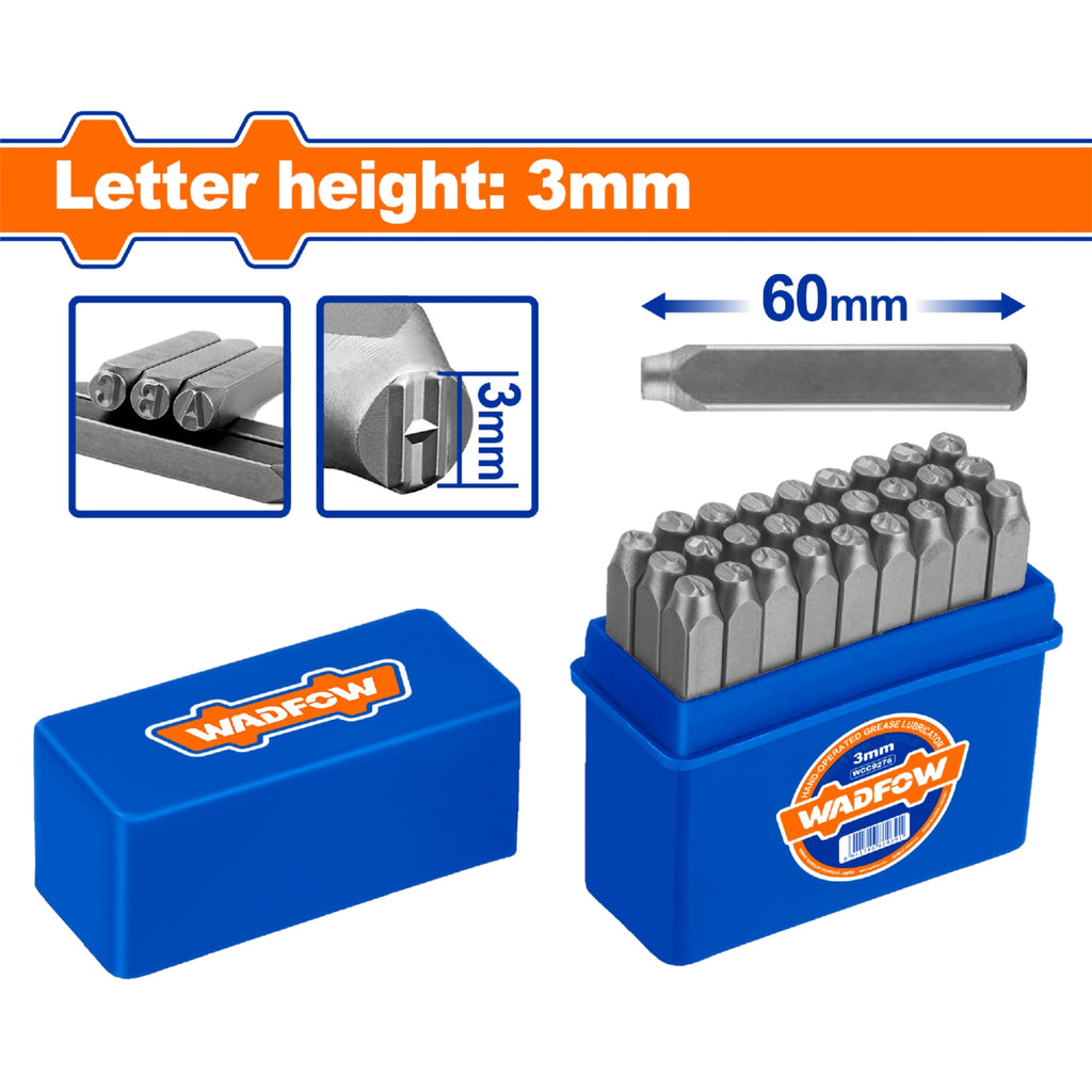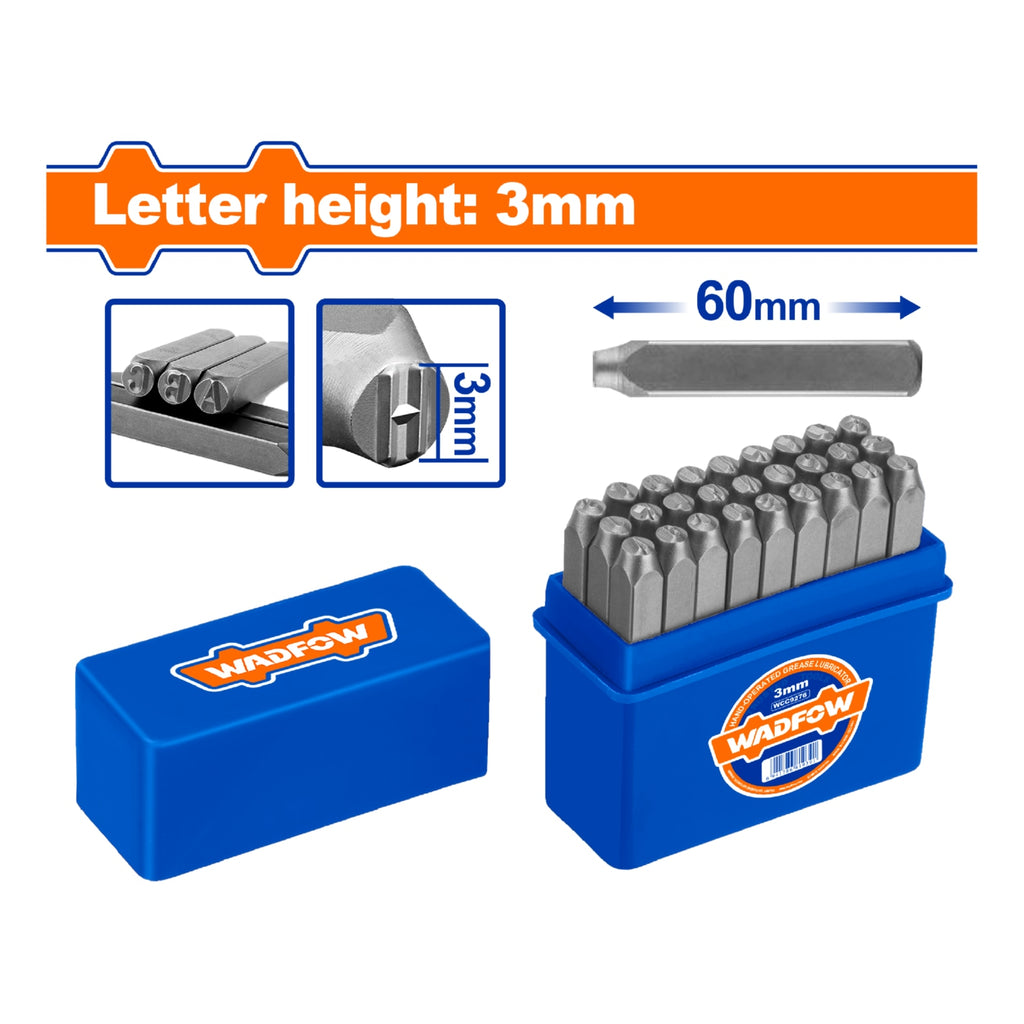 | Características | Cinceles de letras y números Set. 27 piezas. Altura de letra: 3mm. Long: 60mm. Acero al carbono. Incluye: letras de la A a la Z y "&". |