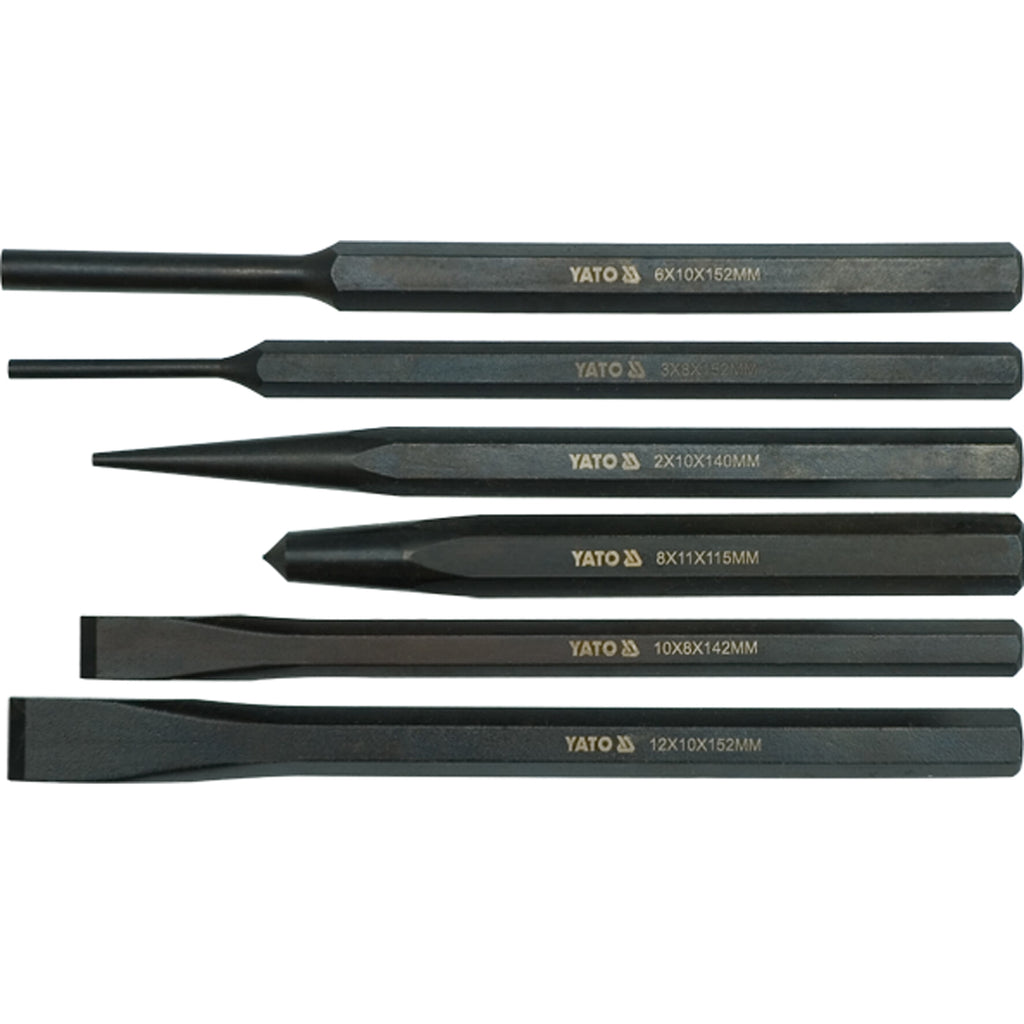 PCS: ACERO CRV, ACABADO NEGRO; LOGOTIPO DE YATO IMPRESO CON LÁSER EN CADA CUCHILLA; 4 PCS PUNCH: 2X10X140 MM, 8X11X115 MM, 3X8X152 MM, 6X10X152MM, 2 QUIALOS PCS: 10X8X142 MM, 12X10X152 MM