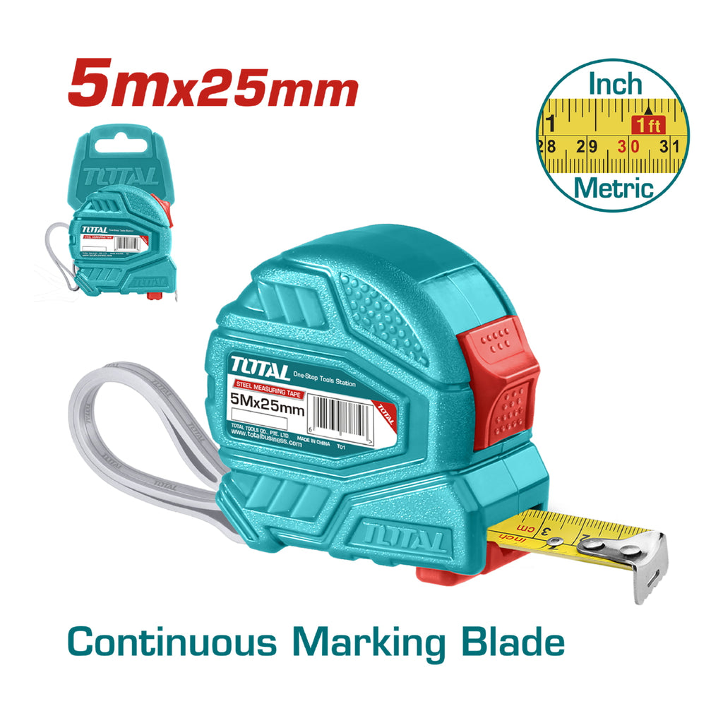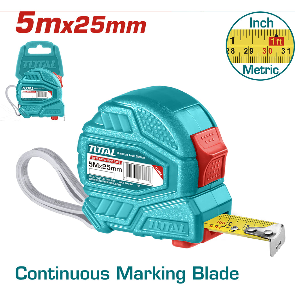 Cinta Metrica de Acero de 5 m. Ancho 25 mm. En Métros y Pulgadas. Doble botón. Material de Cubierta ABS. Alta calidad.