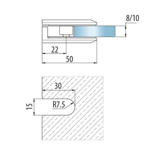 Clip sencillo vidrio muro Aleacion ZAMAC. Economica Acabado Satinado. Vida util 2-3 años