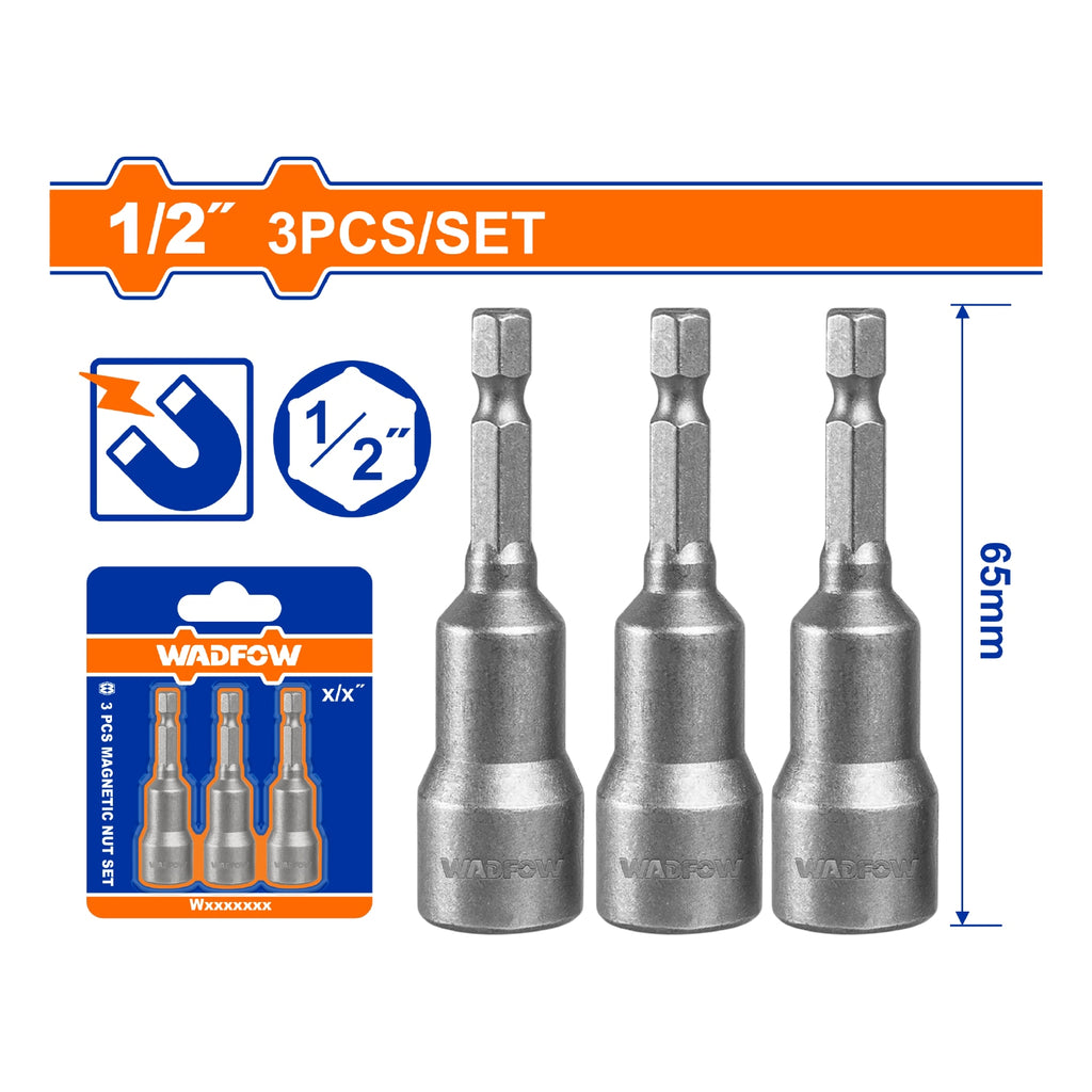 | Características | 3 Piezas juego de tuercas magnéticas 1/2", 3 piezas por juego. Vástago: 1/4" hexagonal. Longitud: 65 mm (2-9/16"). Material: 50BV30. Con un imán fuerte. |