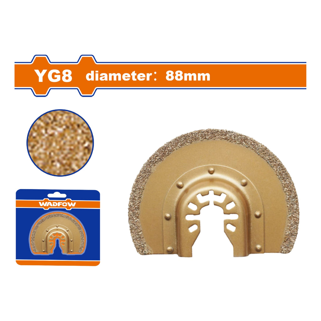 | Características | Cuchilla para Sierra Oscilante de Carburo cementado. Diámetro:88mm. Diseño Semi-circulo. |