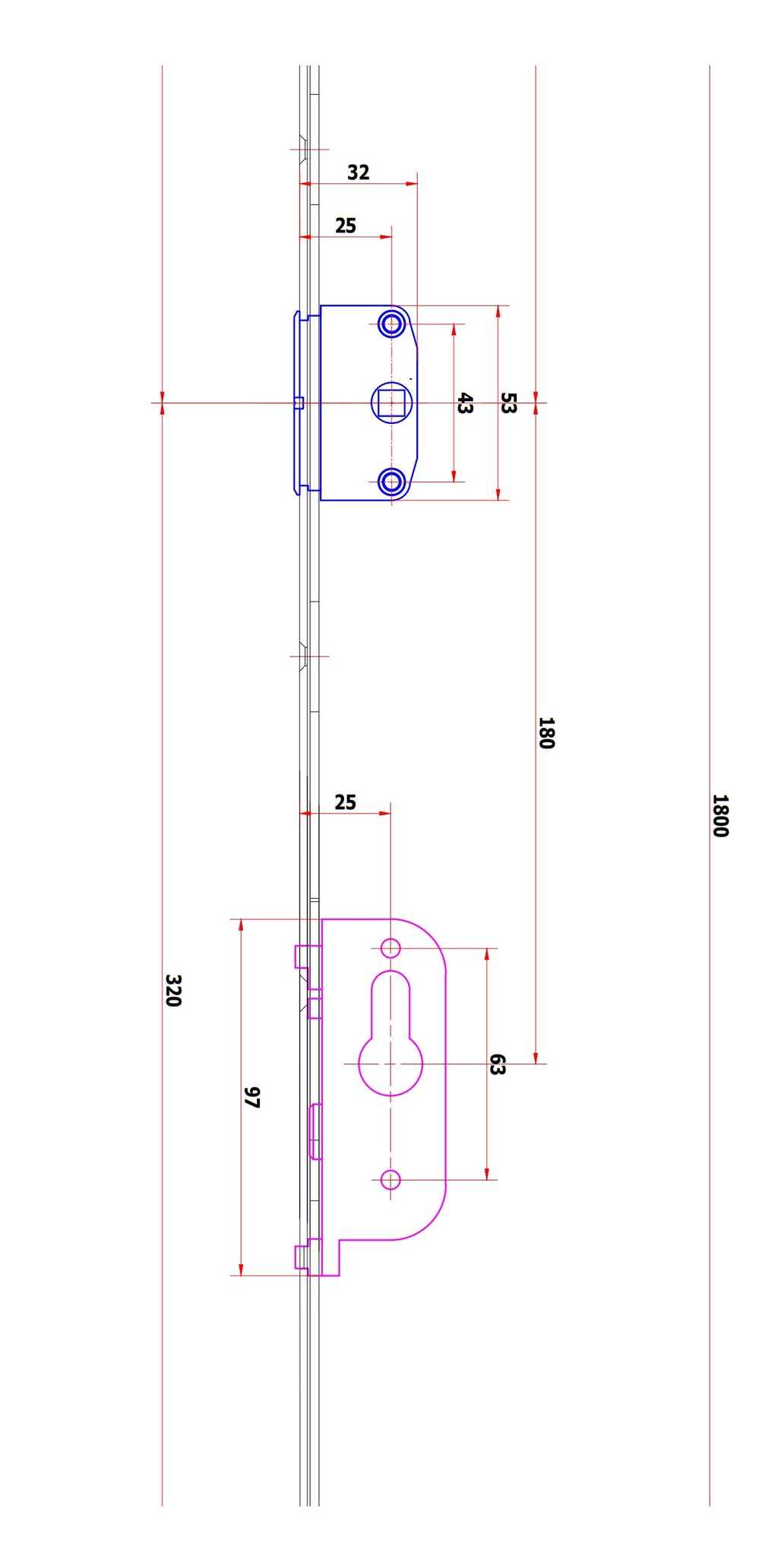 Cuerpo Cierre Multipunto. Tope Antivuelco. Tiene 3 punto Cierre. Funcion con Cilindro Europeo. Largo 1600 mm. Eje desplazado 25 mm para instalacion en sistema Elevable.