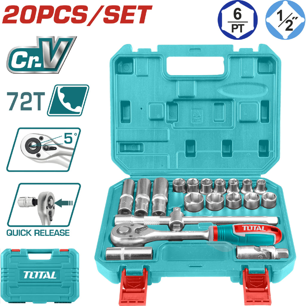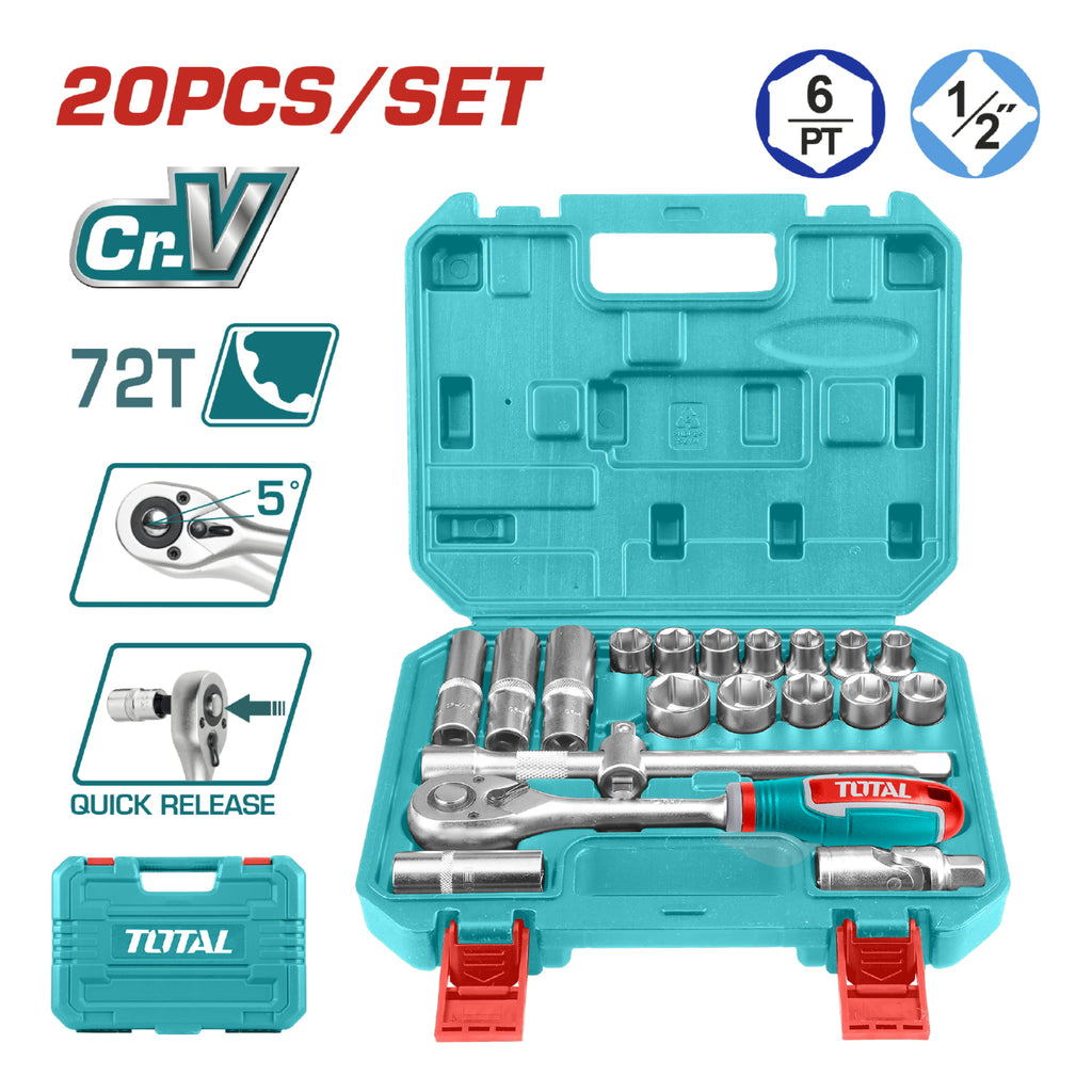 | Características | 20 piezas. Cr-V. Tratamiento térmico. Juego. Incluye: Mango ratchet con 45 dientes, 12 dados socket, 1 dado de bujia, 1 junta universal, 1 barra, 1 junta de 3 vias, 3 dados hexagonales. Tratado térmicamente. |