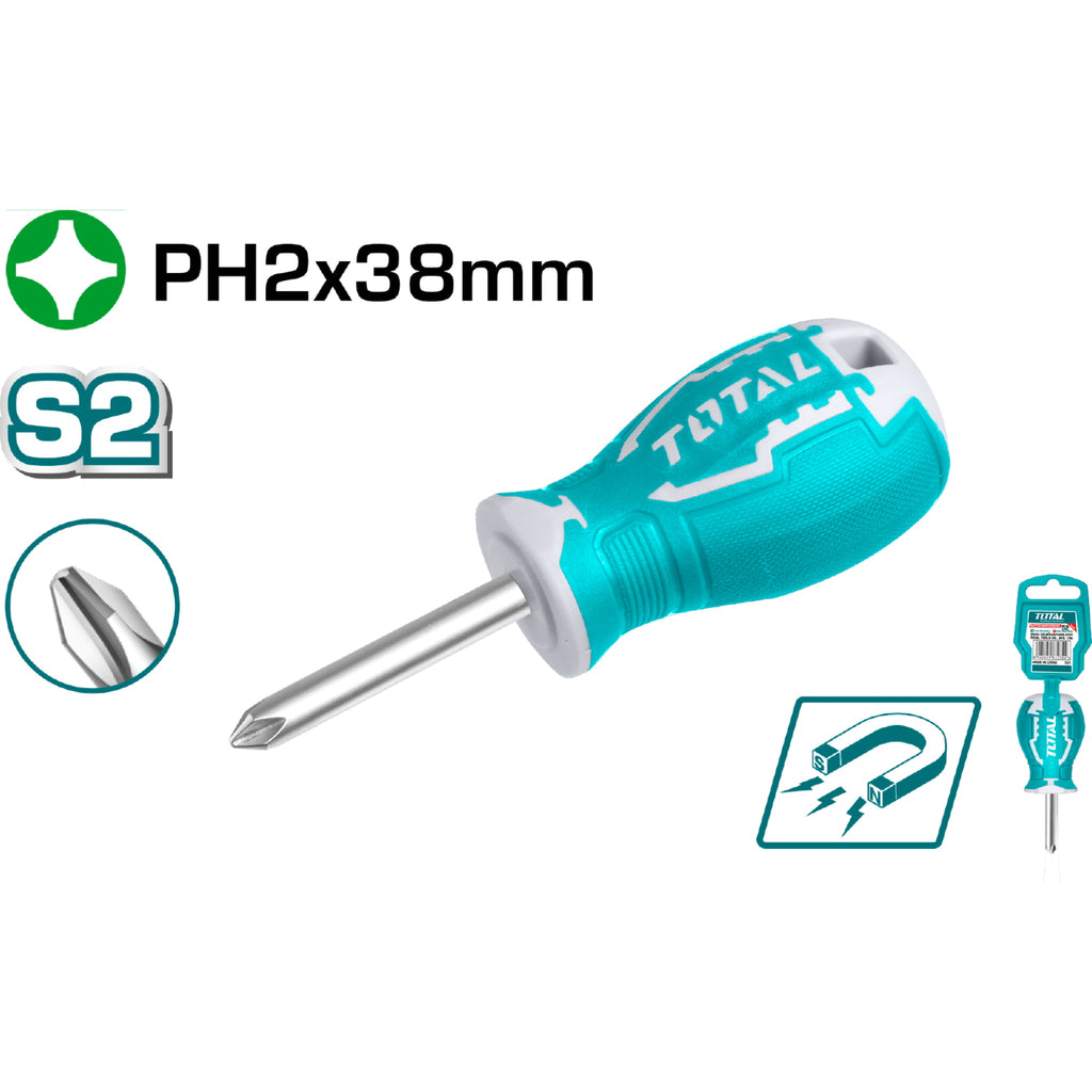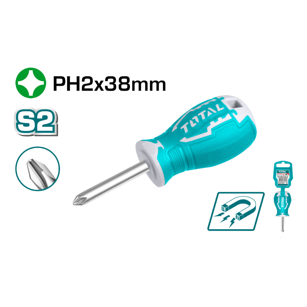 Destornillador corto de estrella. PH2. Diametro: 6mm Largo 38mm.
