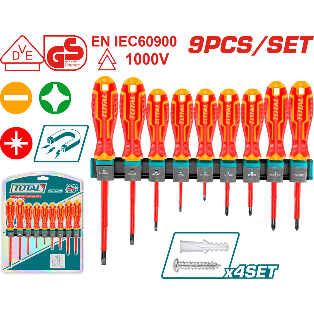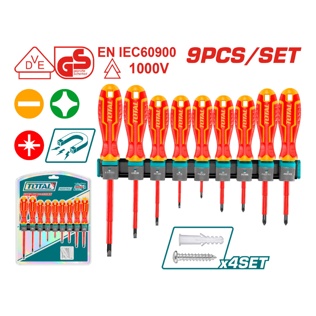 Destornilladores Aislados 1000V Mango Ergonómico. Magnético. Punta Redonda. Set De 9 Piezas. Para Electricista