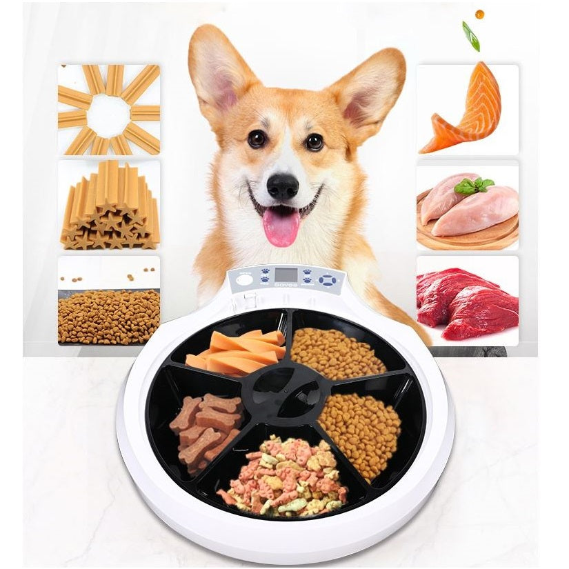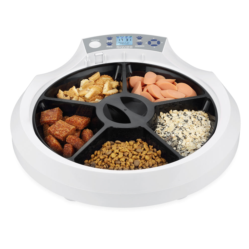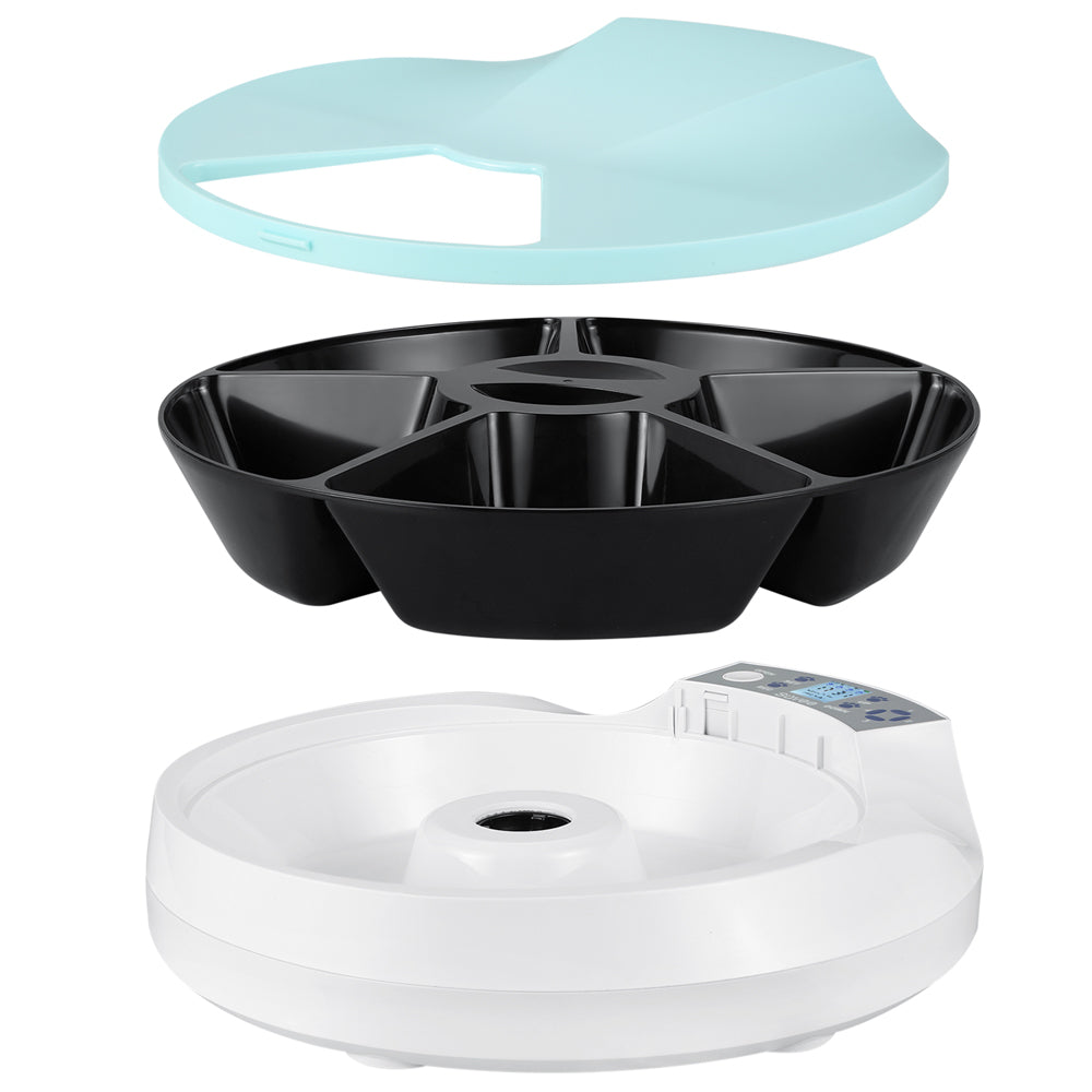 Dispensador de alimentos inteligente de 5 compartimentos 270ml c/u. Color azul. Programa las comidas para tu mascota. Reproduce tu voz grabada a la hora de comer para hacer que las mascotas sientan tu amor.