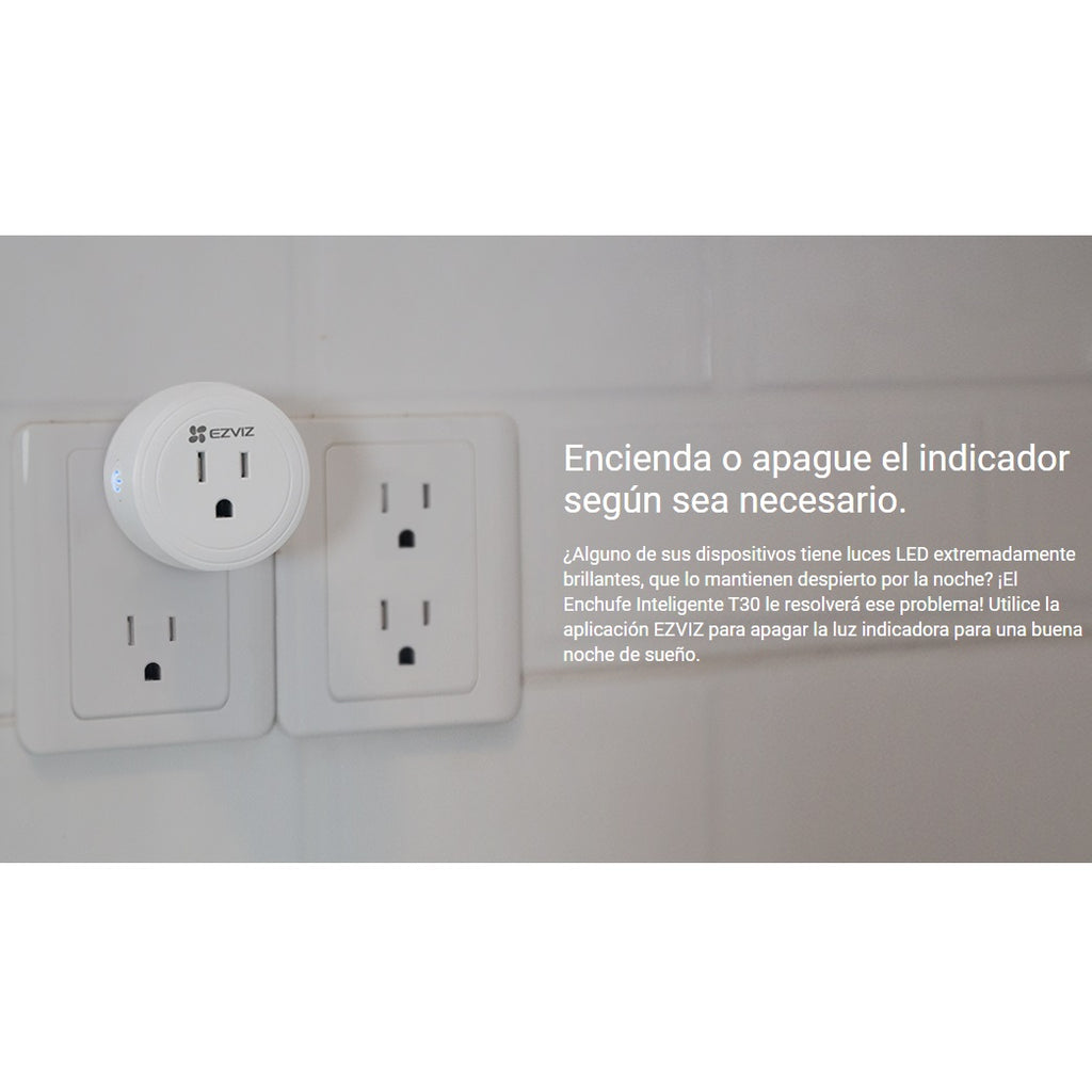 - ¿Alguno de sus dispositivos tiene luces LED extremadamente brillantes, que lo mantienen despierto por la noche? ¡El Enchufe Inteligente T30 le resolverá ese problema! Utilice la aplicación EZVIZ para apagar la luz indicadora para una buena noche de sueño.