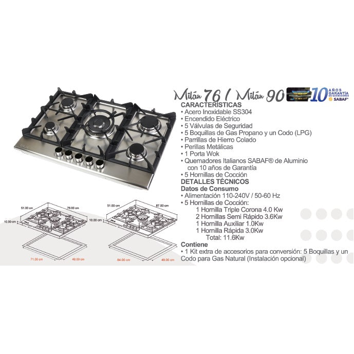 | Incluye | 1 Kit extra de accesorios para conversión con 5 Boquillas y un Codo para Gas Natural (Instalación opcional) |