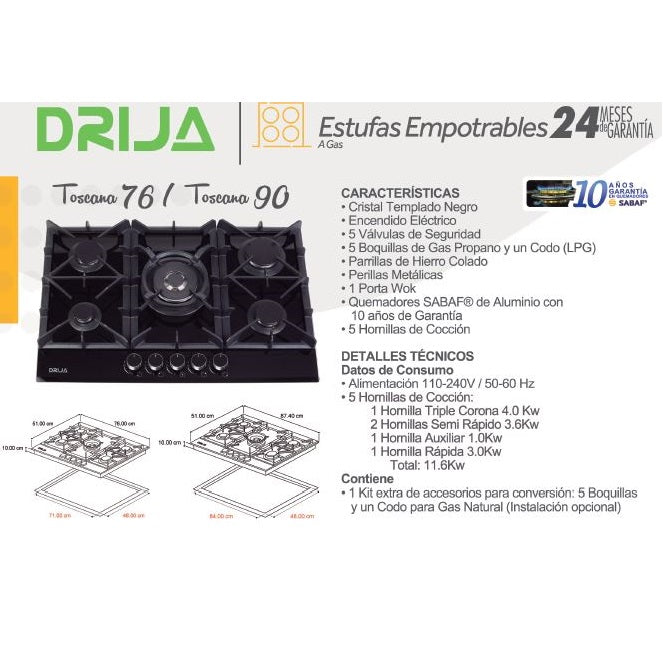 | Características | Cristal templado Negro.Encéndido Eléctrico. 5 válvulas de seguridad. 5 Boquillas de Gas Propano y un Codo (LPG) |