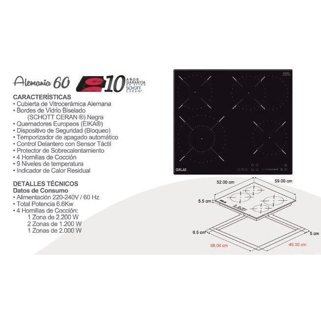 •Cubierta de Vitrocerámica Alemana (SCHOTT CERAN) Negra.
