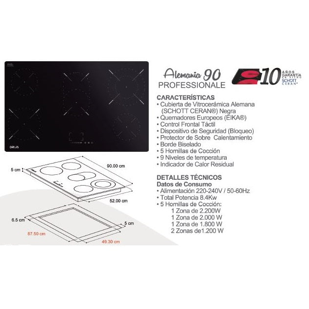 •Cubierta de Vitrocerámica Alemana (SCHOTT CERAN®) Negra.