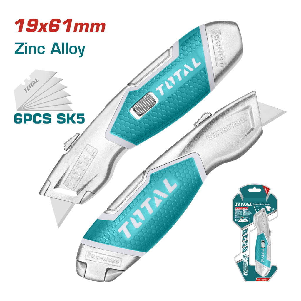 Exacto de 175 mm. Con cuchillas de 61 mm x 19 mm. SK5. Con 6 cuchillas de repuesto. Cuerpo de aleación de zinc. Peso neto: 256g.