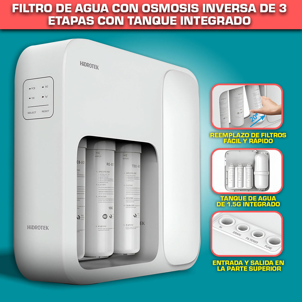 Filtro de agua con Osmosis Inversa de 3 etapas con tanque integrado.