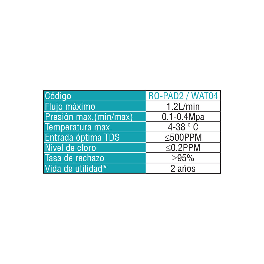 Filtro repuesto RO-PAD2 cambiar cada 2 años aproximadamente. Funciona con WAT01 Snowpad Membrana de ósmosis inversa remoción de bacterias, metales pesados, sal, materia disuelta y químicos