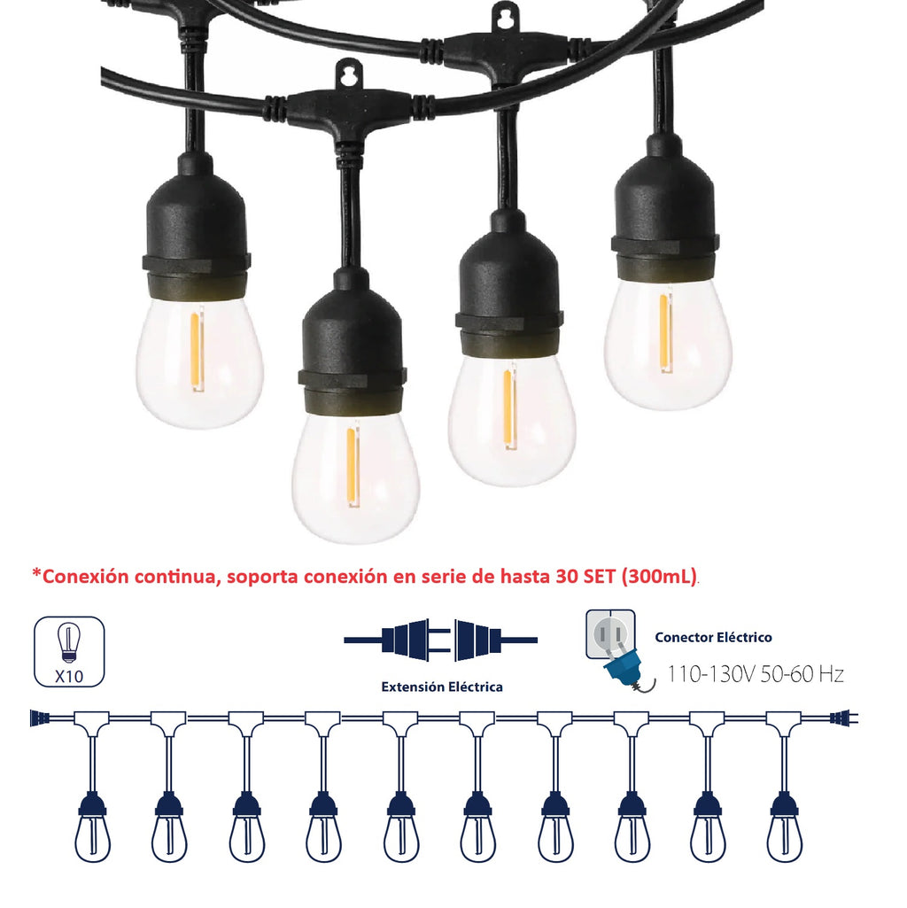 | *Nombre | Guirnalda LED luces 10M 27K 110V Exterior Interior Focos E27. Conexión continua hasta 30 SET (300mL) |