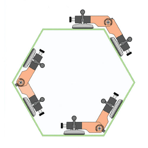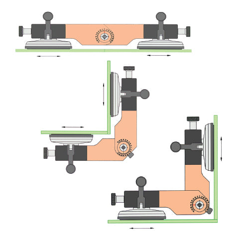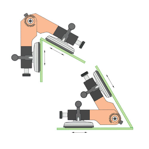 Herramienta de montaje de vidrio multiángulo, sostiene cristales desde fuera o dentro de las superficies, los cristales se pueden fijar en el ángulo deseado y posicionarse para adherirse fácilmente con pegamento UV o adhesivo de silicona, la altura y la posición se puede ajustar (18mm) con las perillas en cada brazo. Diámetro de la copa Ø120mm. Ventosa de goma de repuesto código (X201.01). Sostiene paneles de vidrio con firmeza hasta que se pegan el uno al otro de manera precisa. Ajustable entre 40º a 300º grados.