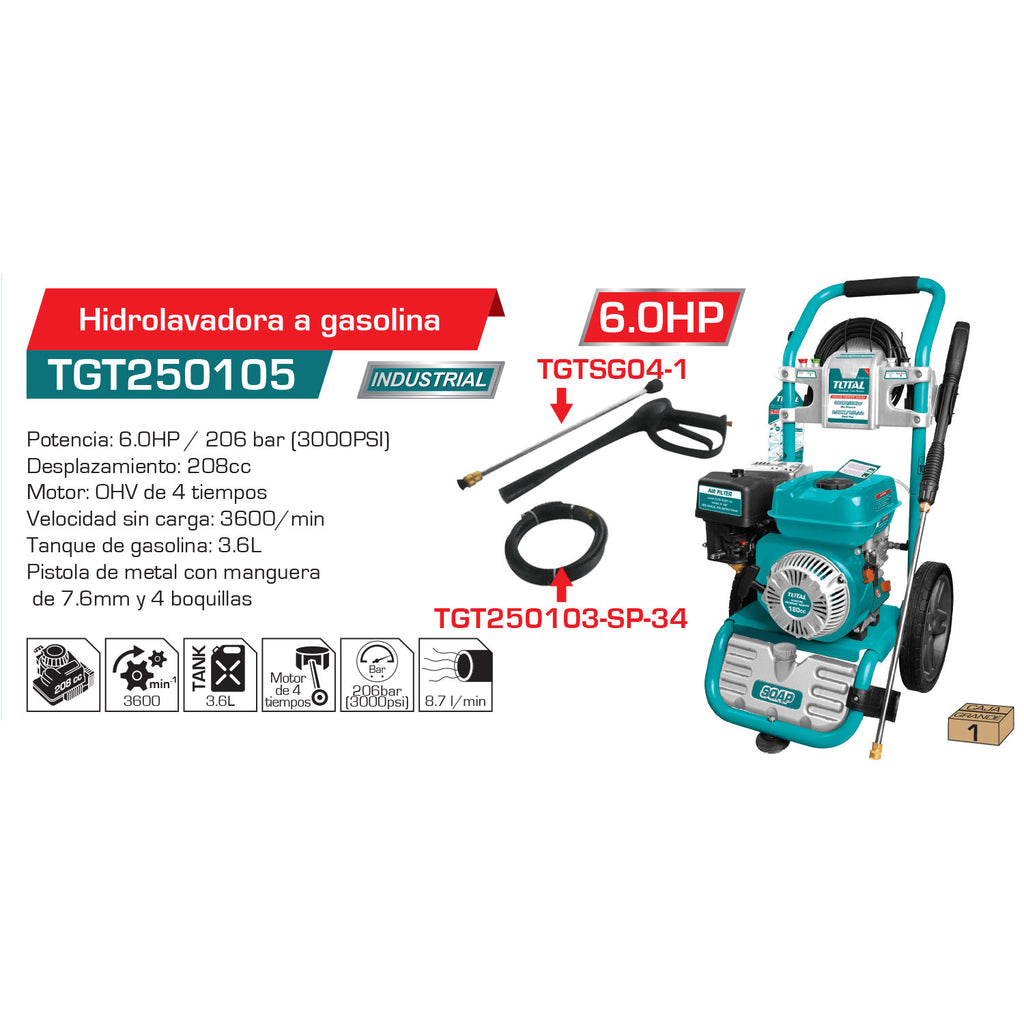 | Compatible | Manguera accesorio para hidro lavadora gasolina cod TGT250103; Pistola para hidro lavadora a gasolina cod TGTSG04-1 |