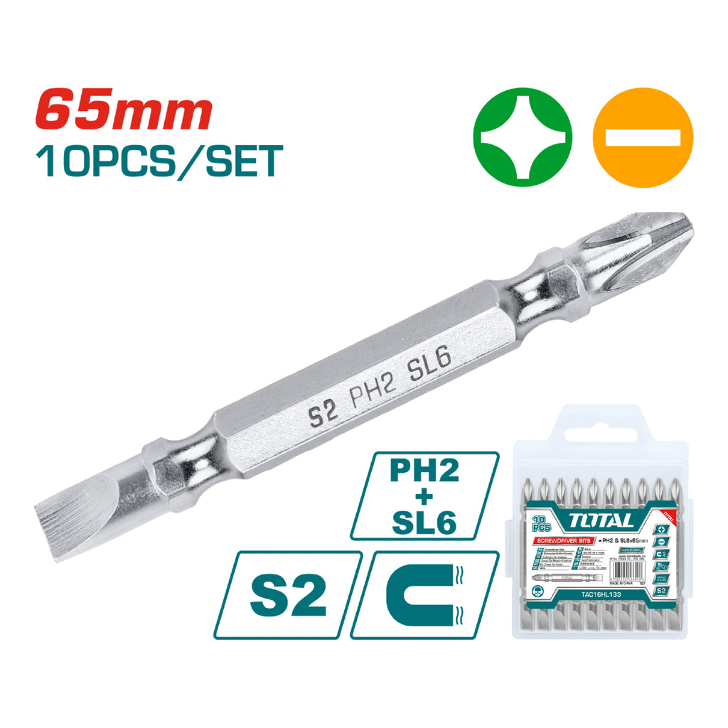 Juego 10pcs puntas phillips PH2 y paleta SL6.0 mm 65 mm largo. Acero industrial S2. Magneticas